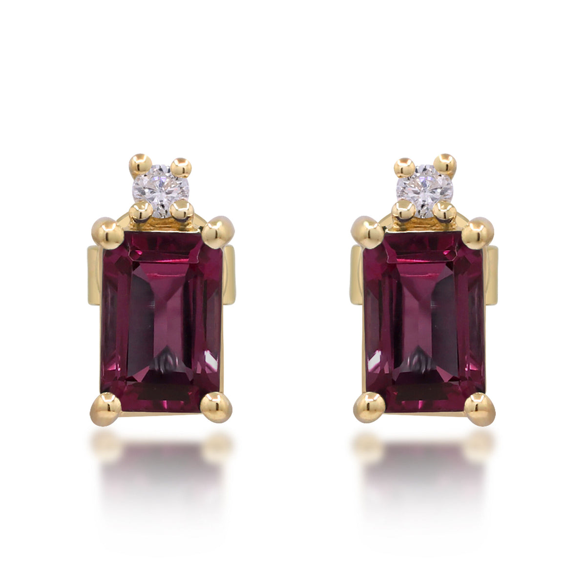 These Garnet and Diamond Accent Earrings by Helzberg combine rich color with refined sparkle. Each 10K yellow gold stud features a 6x4 millimeter emerald-cut garnet accented by a round diamond, creating an elegant design for those who appreciate classic luxury.