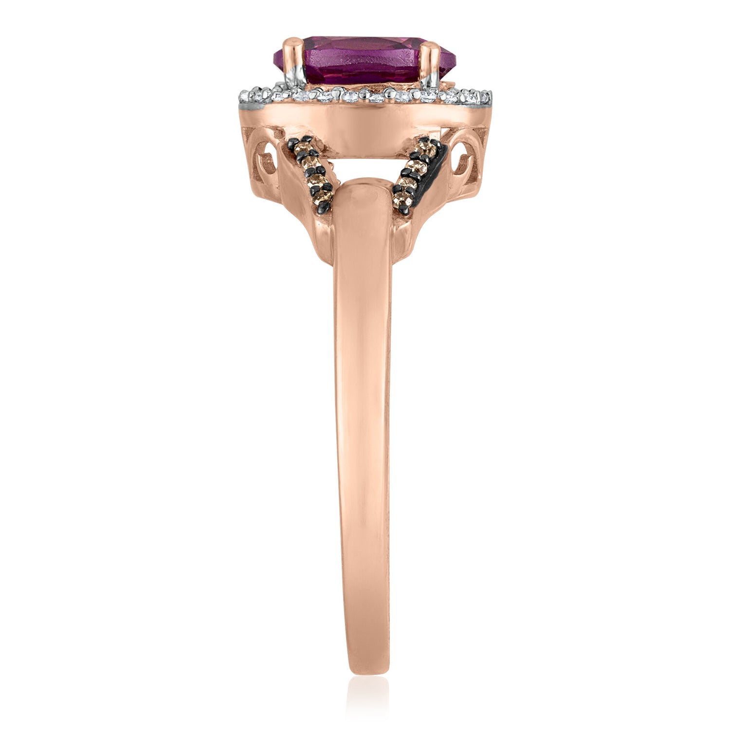 These Rhodolite Garnet and Diamond Rings by Helzberg captivate with an elegant and romantic design that radiates timeless beauty. Centered on a stunning oval brilliant cut rhodolite garnet, this ring is encircled by 16 round single cut brown diamonds and 26 round single cut white diamonds, creating a dazzling frame that enhances the rich warmth of the 10K rose gold band. This piece symbolizes passion and strength, perfect for marking a special moment or adding a luxurious touch to any ensemble. Ideal for those who appreciate intricate detail and classic sophistication.