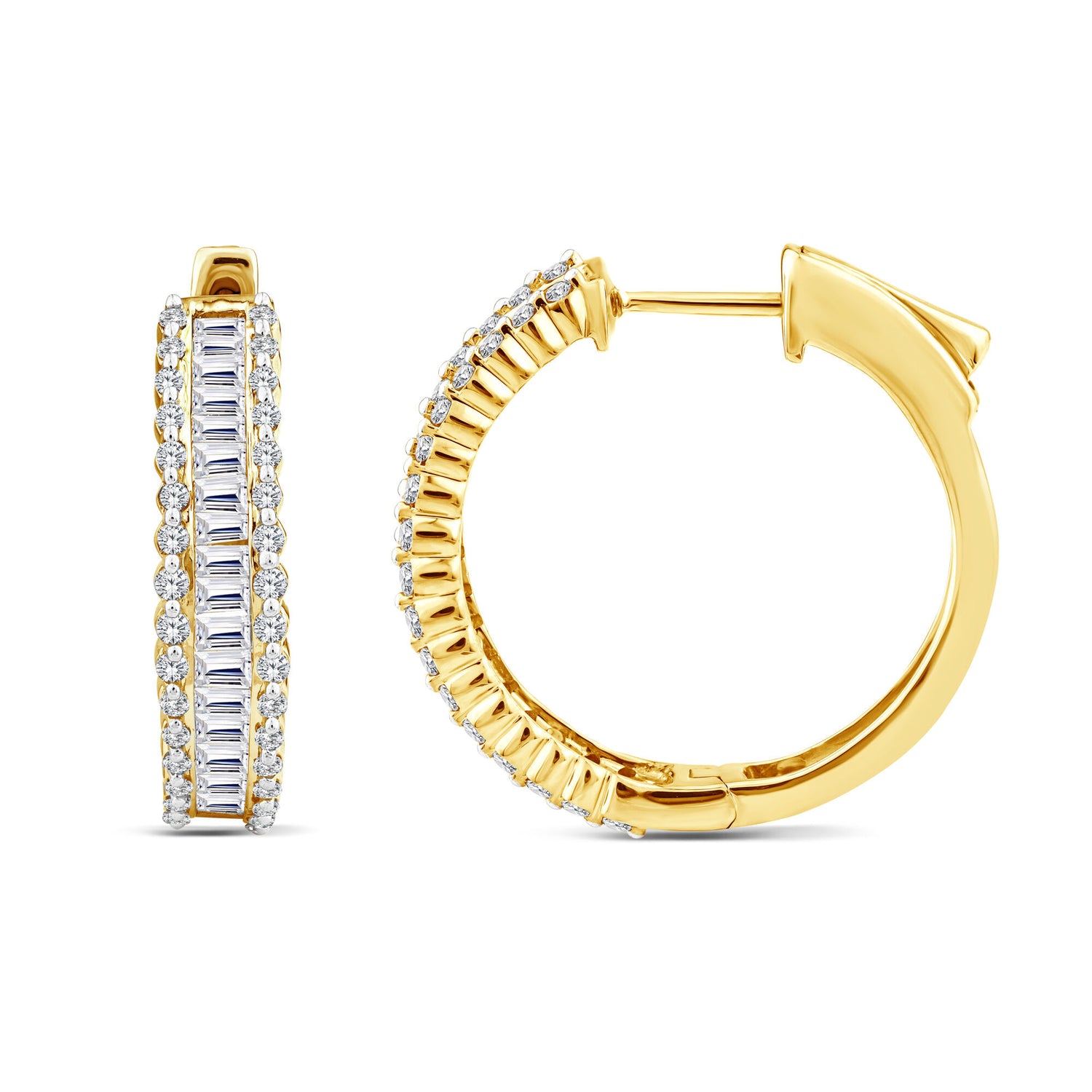 These Baguette and Round Diamond Hoop Earrings by Helzberg in 14K yellow gold showcase distinctive style and brilliance. Each earring is adorned with 21 baguette diamonds and 34 round single cut diamonds, totaling 3/4 carat per earring, combining quality and sophistication for a striking accessory.