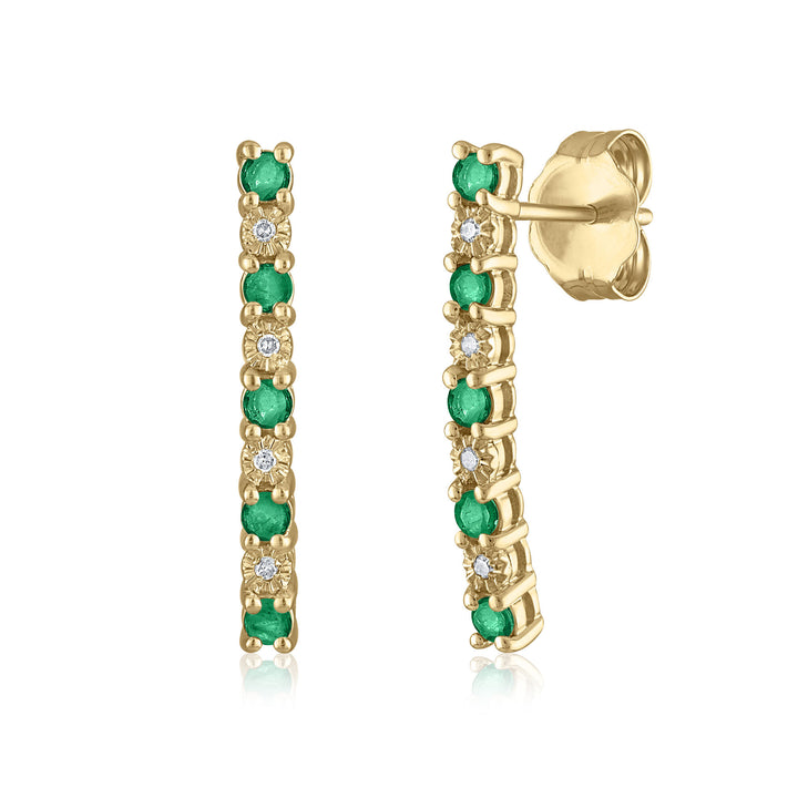 These Emerald and Diamond Accent Earrings by Helzberg are crafted from luxurious 14K yellow gold and feature ten round brilliant cut emeralds, each approximately 2.6MM in diameter. Accentuated by eight round single cut diamonds, the earrings balance vibrant green hues with subtle sparkle, creating an elegant and timeless statement piece.