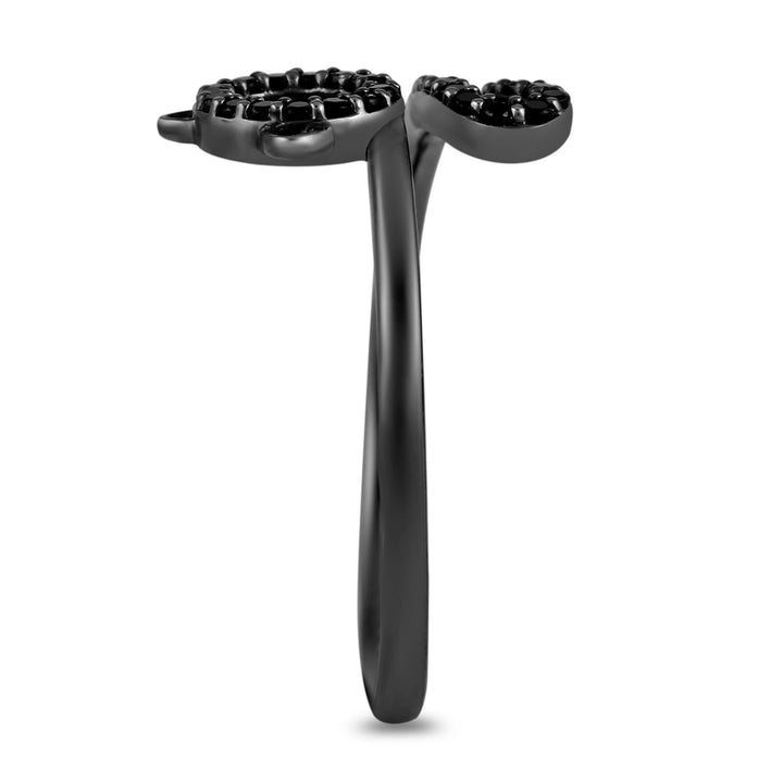Sterling silver bypass ring set with thirty-nine round single cut heat-treated black diamonds totaling 1/5 ct. tw. Standard sizing and setting.