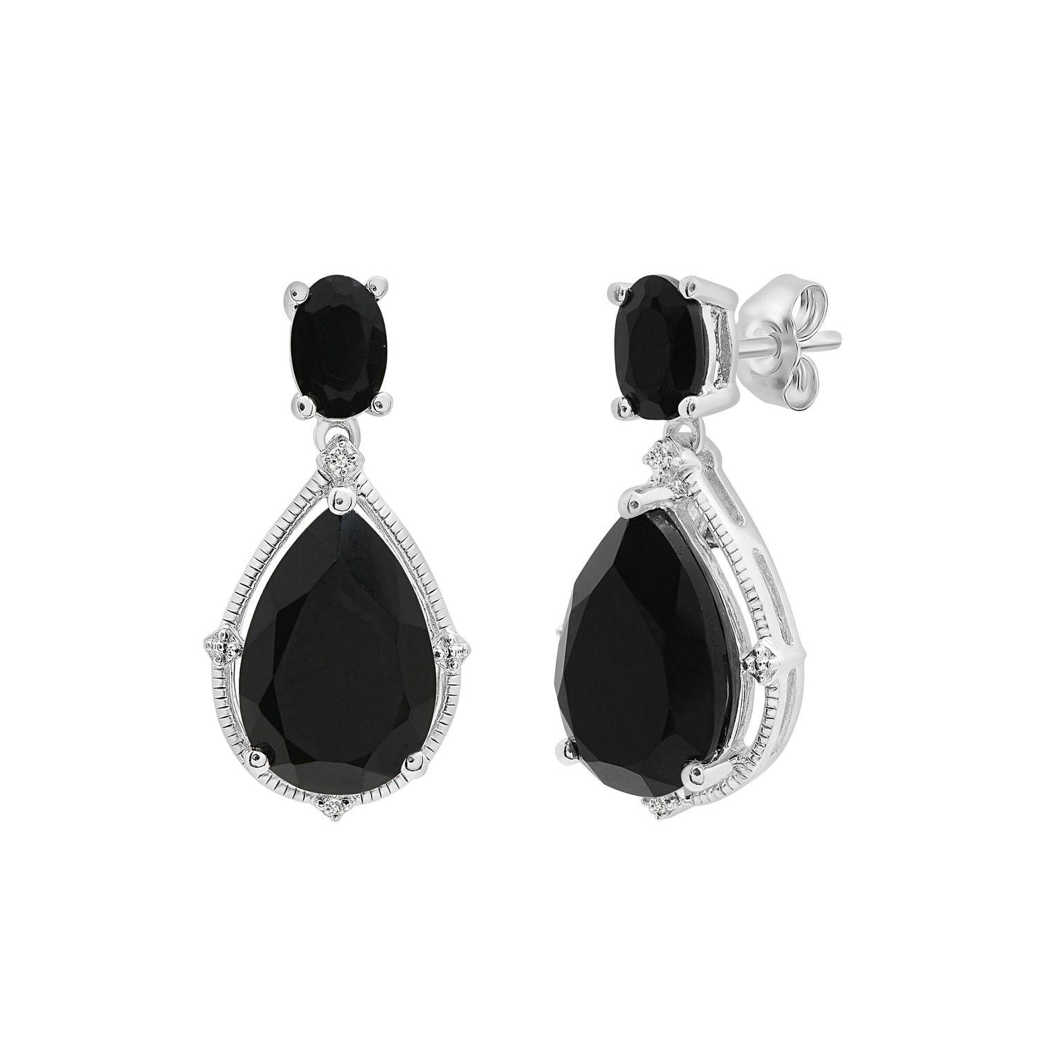 Handcrafted in sterling silver with two pear brilliant cut black onyx (12x8 mm), two oval brilliant cut black onyx (6x4 mm), and four round single cut diamond accents. Drop earring dimensions [not specified]. Post back closures.