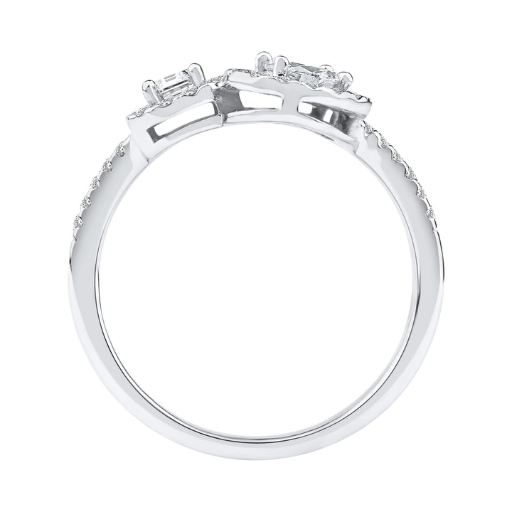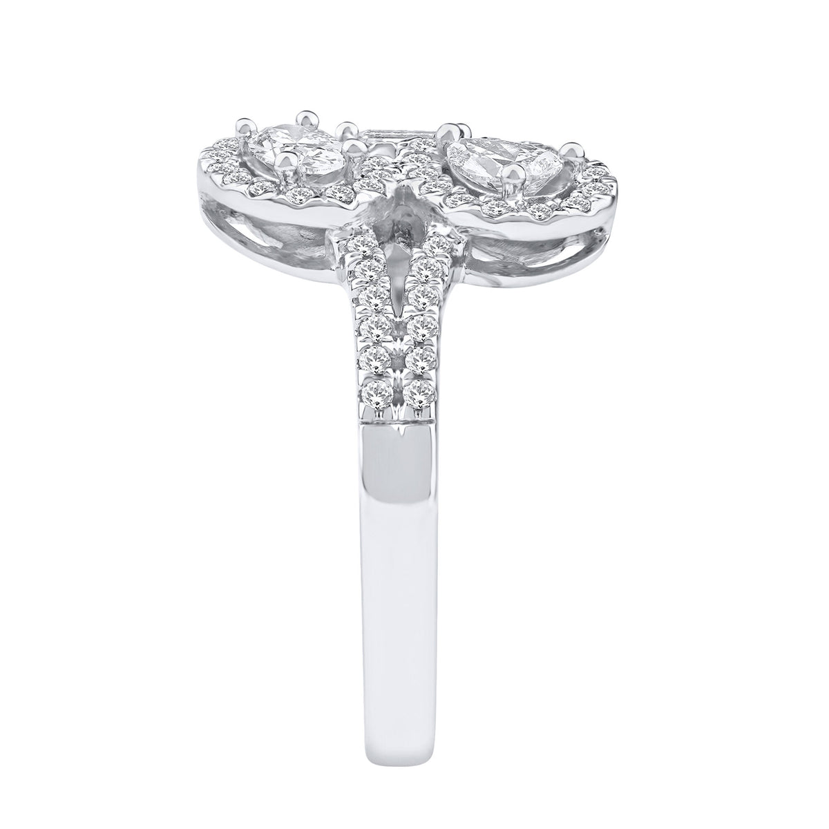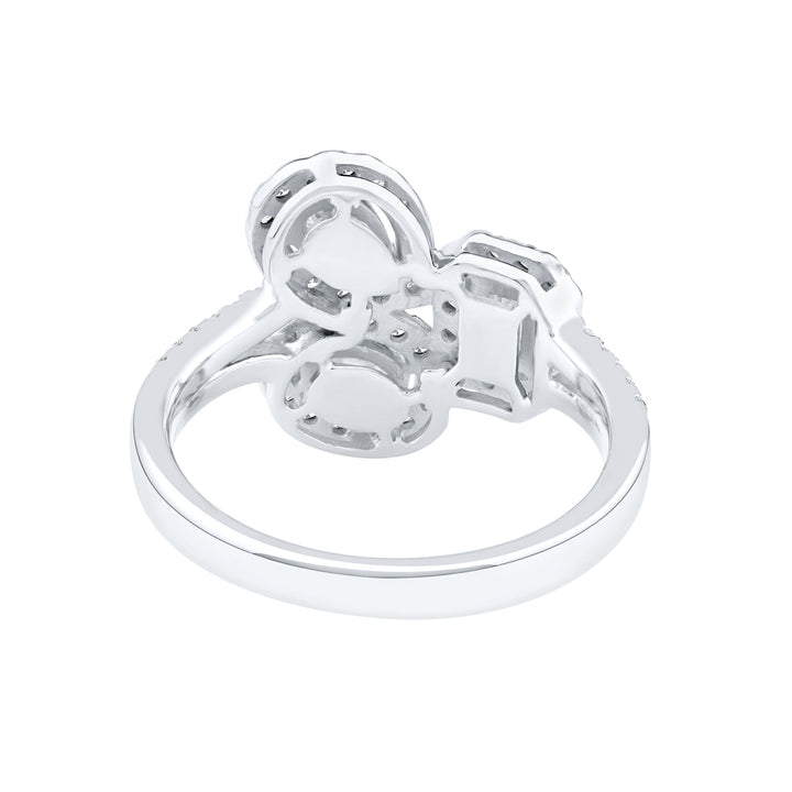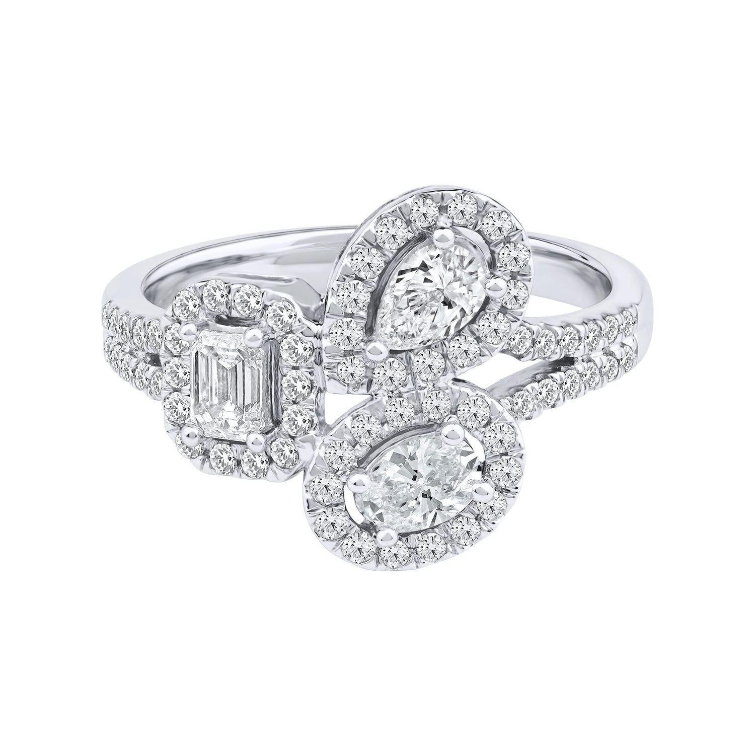Crafted in 14K white gold with one pear brilliant cut, one emerald cut, and one oval brilliant cut lab grown diamond, plus 64 round brilliant cut lab grown diamonds. Total carat weight [not specified]. Ring size [not specified]. Polished finish.