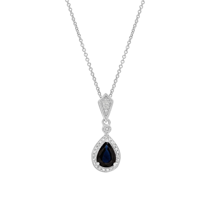 Crafted in sterling silver with one 8x6mm pear brilliant cut blue sapphire and 12 round single cut diamond accents. Pendant dimensions not specified.