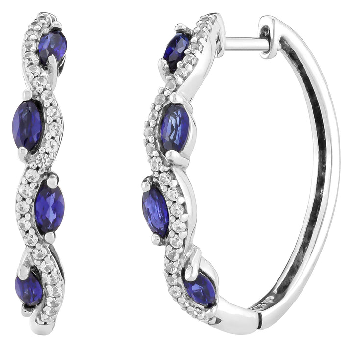 Crafted in sterling silver with eight marquise brilliant cut lab-created blue sapphires (~4mm x 2mm) and forty-eight round brilliant cut lab-created white sapphires (~1mm). Hoop dimensions not specified.