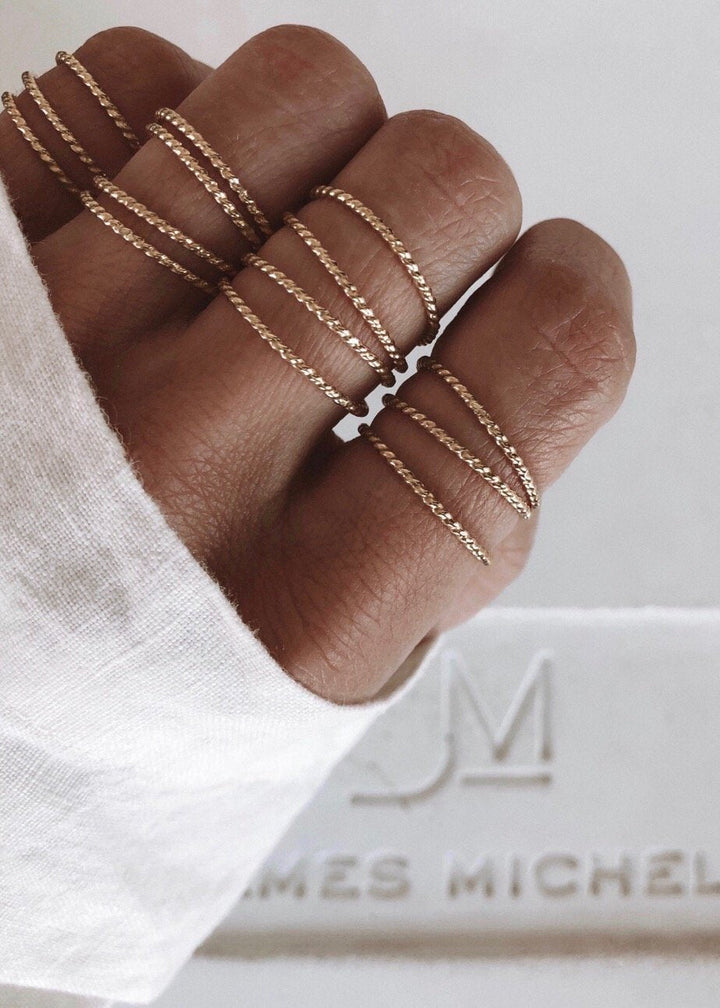 Add a twist to your style with the James Michelle Twist Stacking Ring! Made from waterproof brass with a durable 10k gold PVD coating, this trendy ring is hypoallergenic and perfect for mixing and matching with your favorite pieces. A must-have for your chic jewelry lineup!