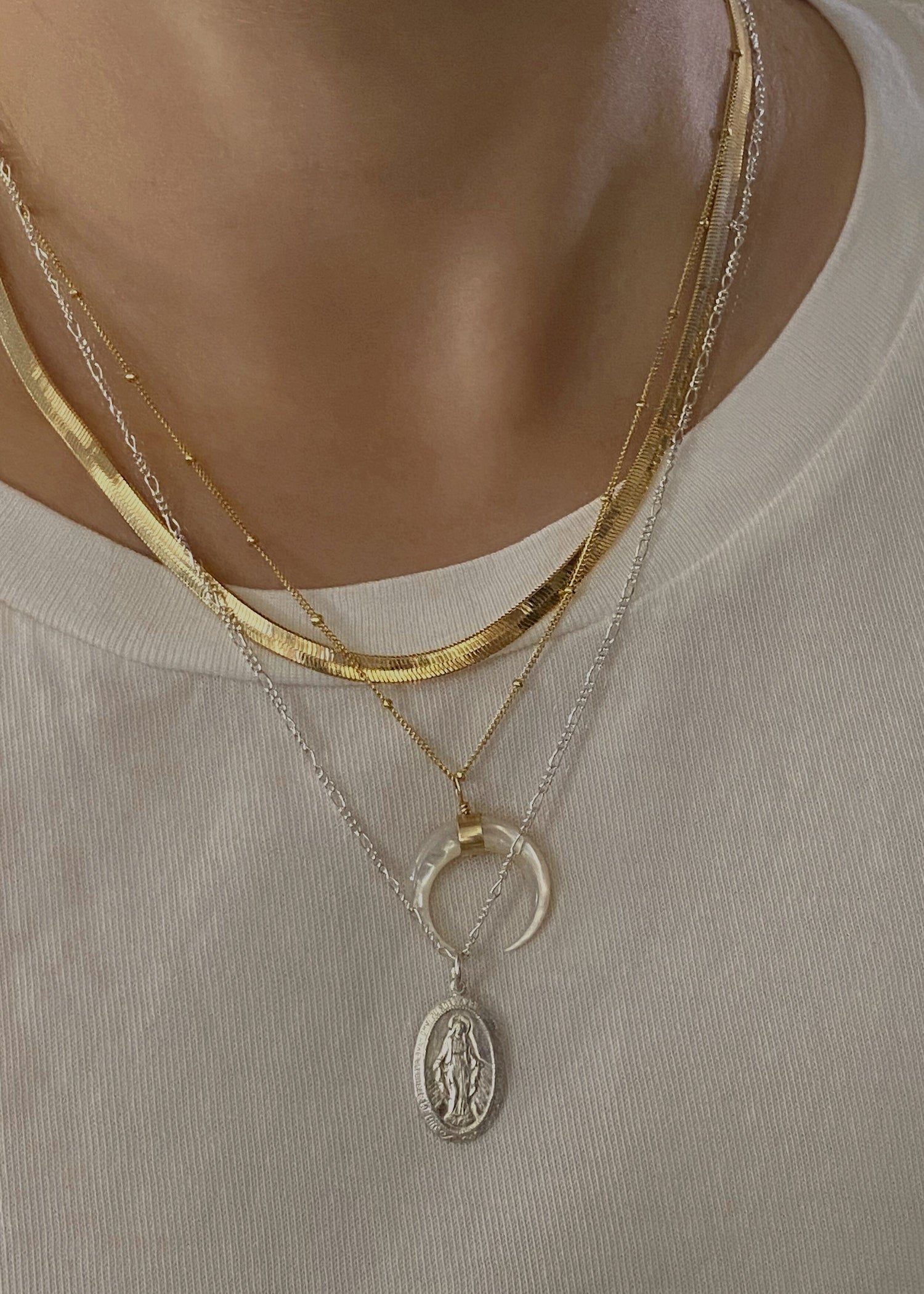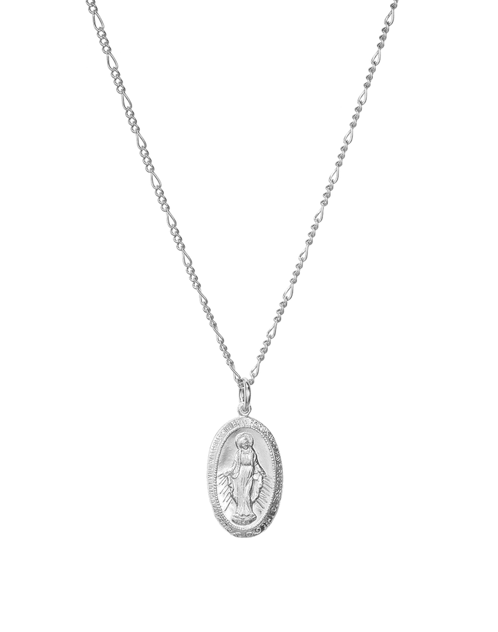 Wear your faith with the James Michelle Faith No.2 Necklace! Made from sterling silver, this elegant pendant measures 7/8' in length (rosary Mary) and hangs on a 1.3mm figaro chain for a stylish touch.