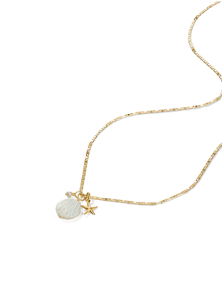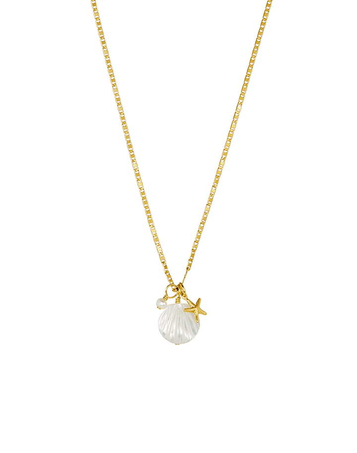 Dive into summer with the James Michelle Calypso Necklace! Waterproof and tarnish-proof, this stylish piece features a pearlized clamshell, freshwater pearl, and 14k gold fill starfish pendant on a durable chain for a trendy touch!