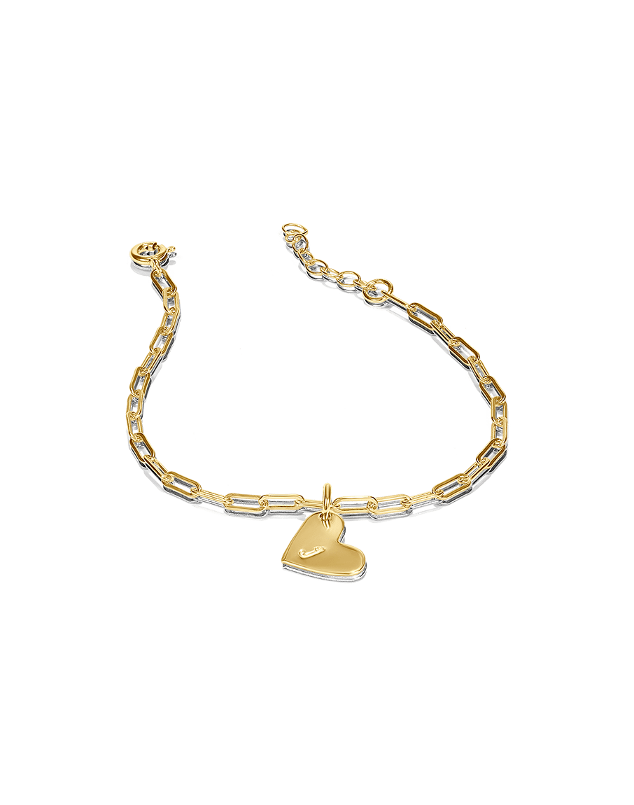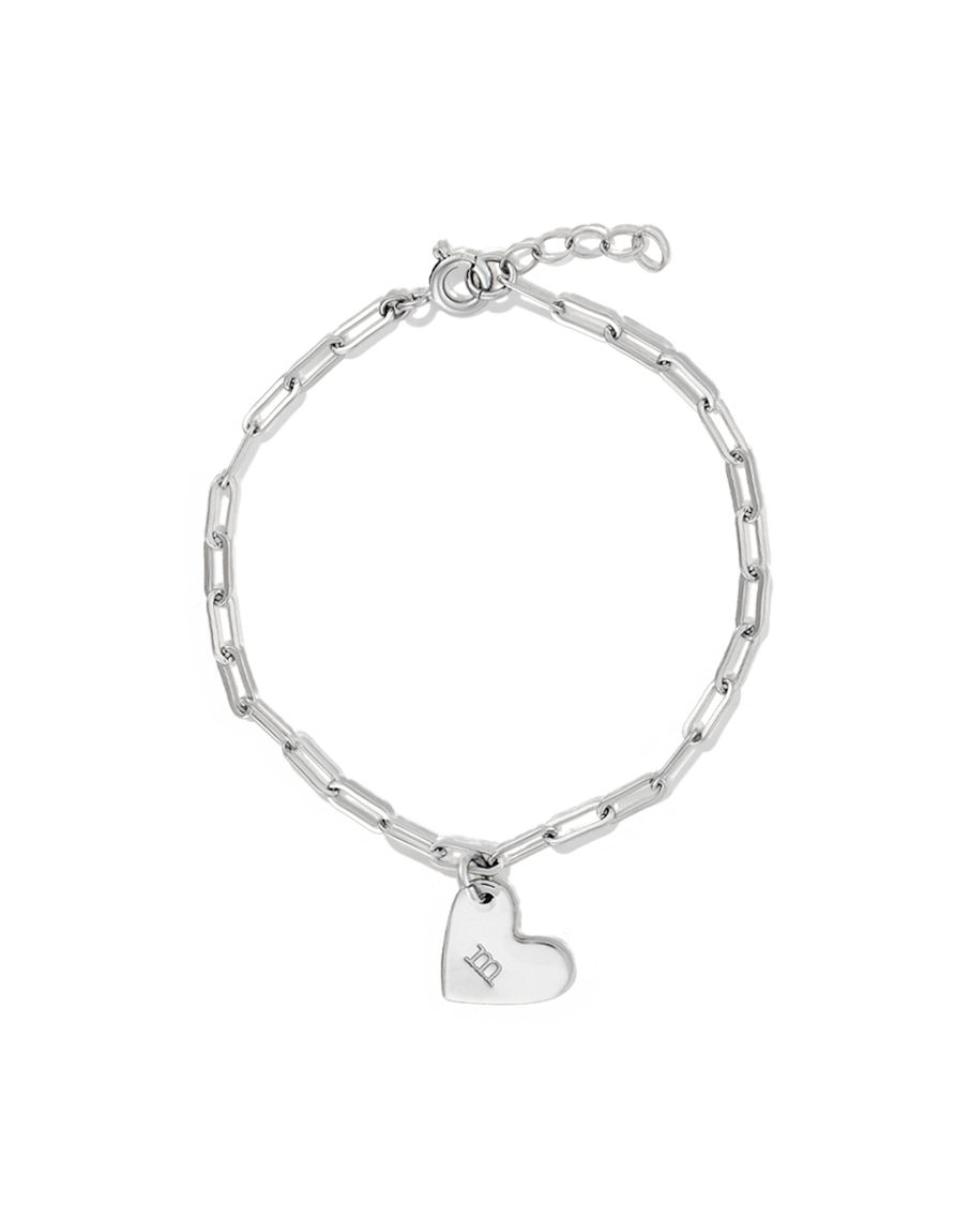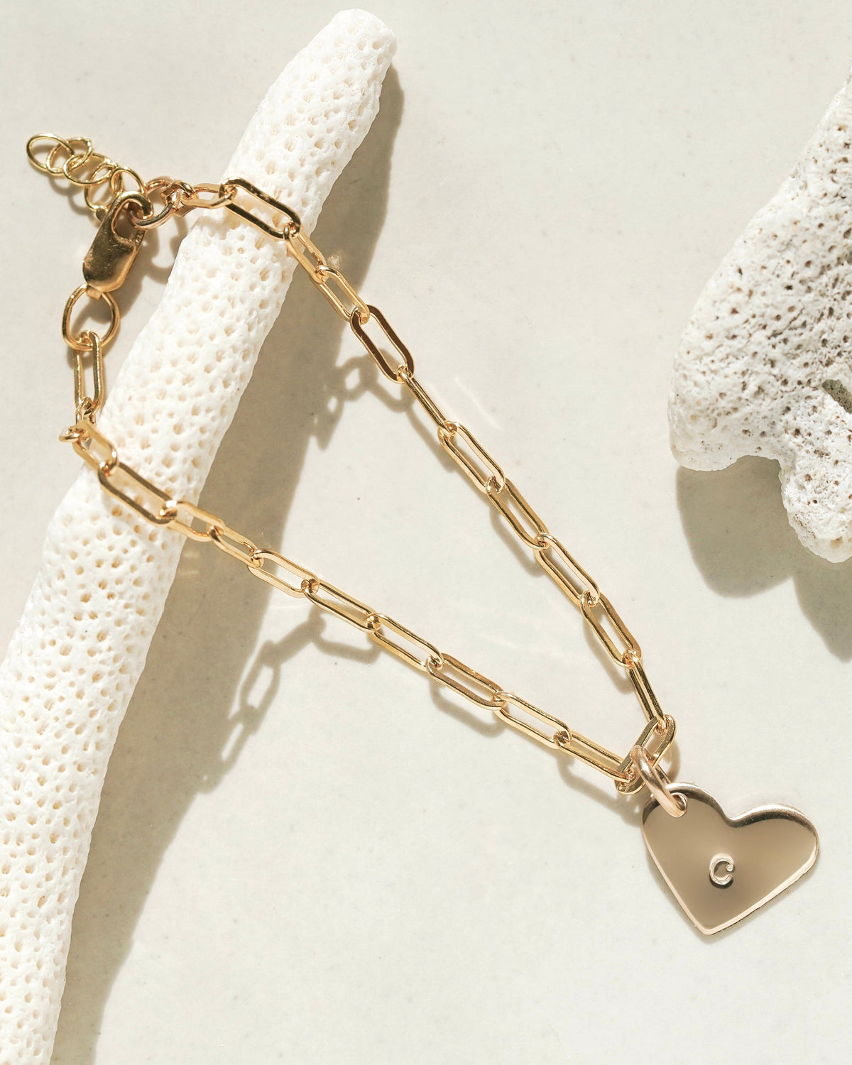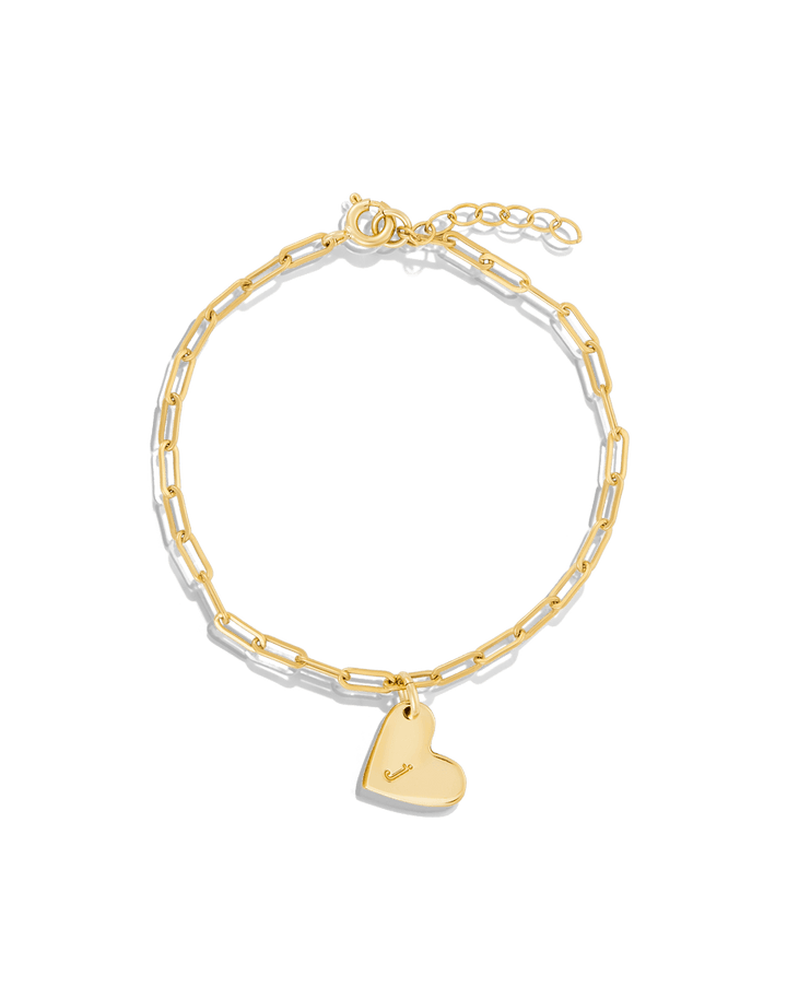 Personalize your wrist with the James Michelle Initial Heart Bracelet! Made from 14k gold fill or sterling silver, this charming bracelet features a heart charm measuring 1/2' and an adjustable length of 6' - 7.5' for a perfect fit!