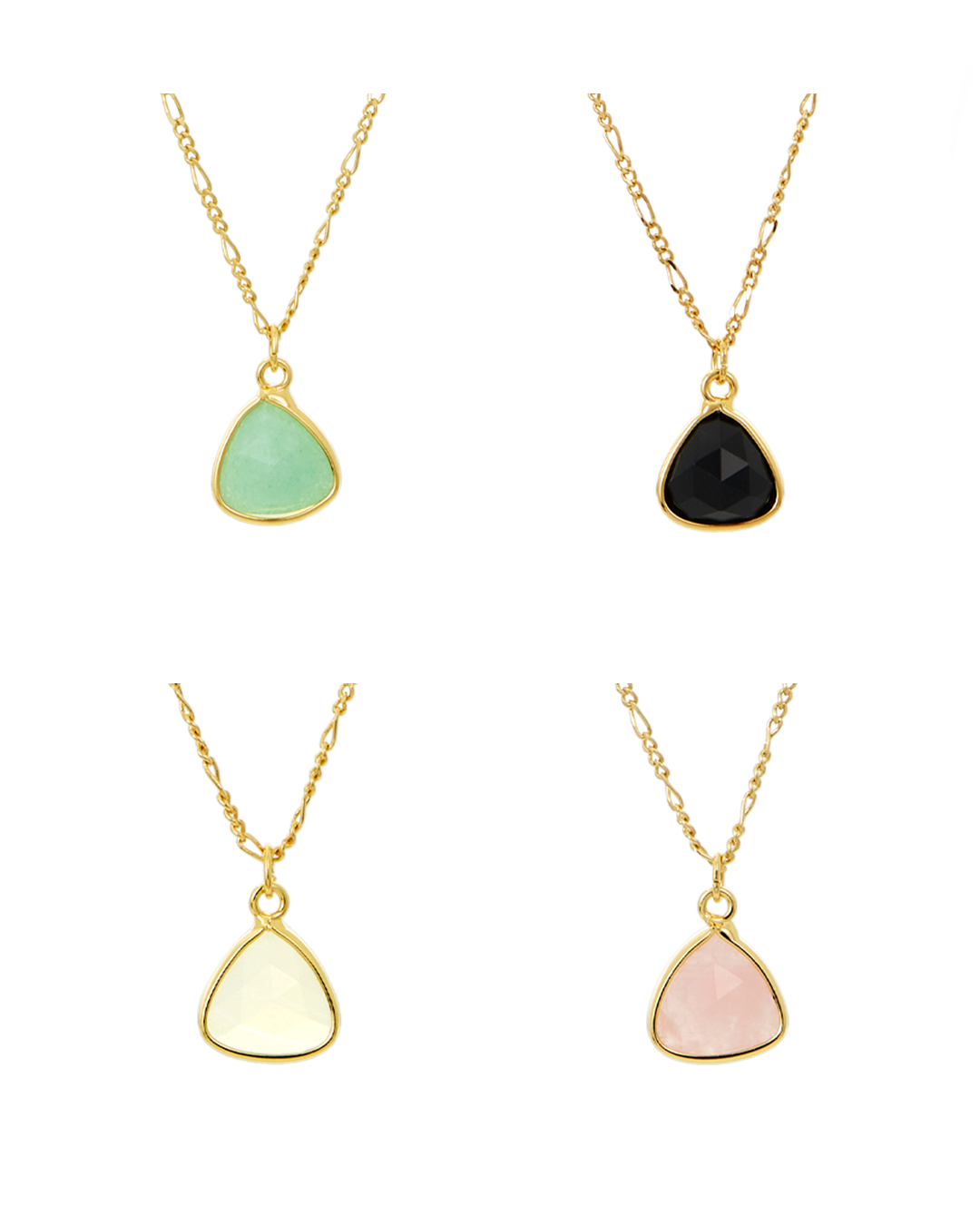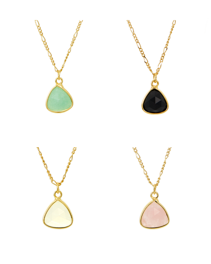 Add a pop of color with the James Michelle Gemstone Necklace! Crafted from 10k gold plated over brass, this chic piece features a 1/2' x 3/8' stone (choose from rose quartz, obsidian, opal, or green aventurine) on a 2.3mm figaro chain with an adjustable length of 16' - 18'.