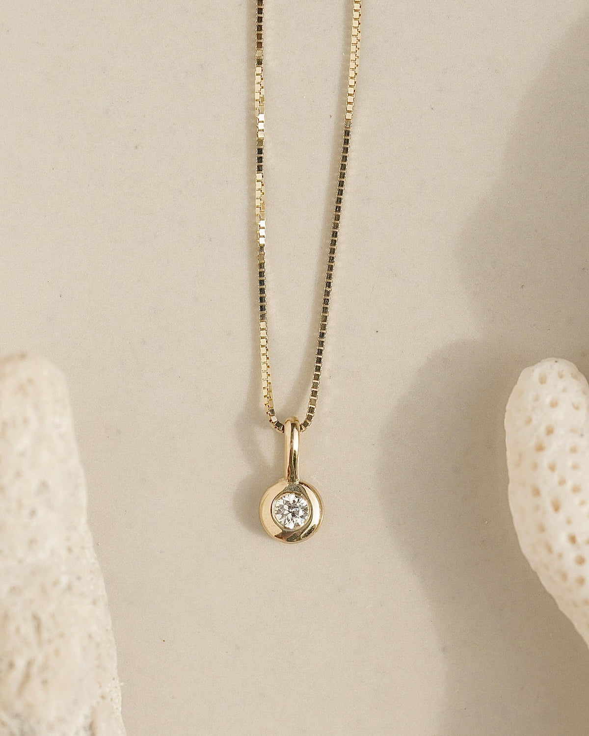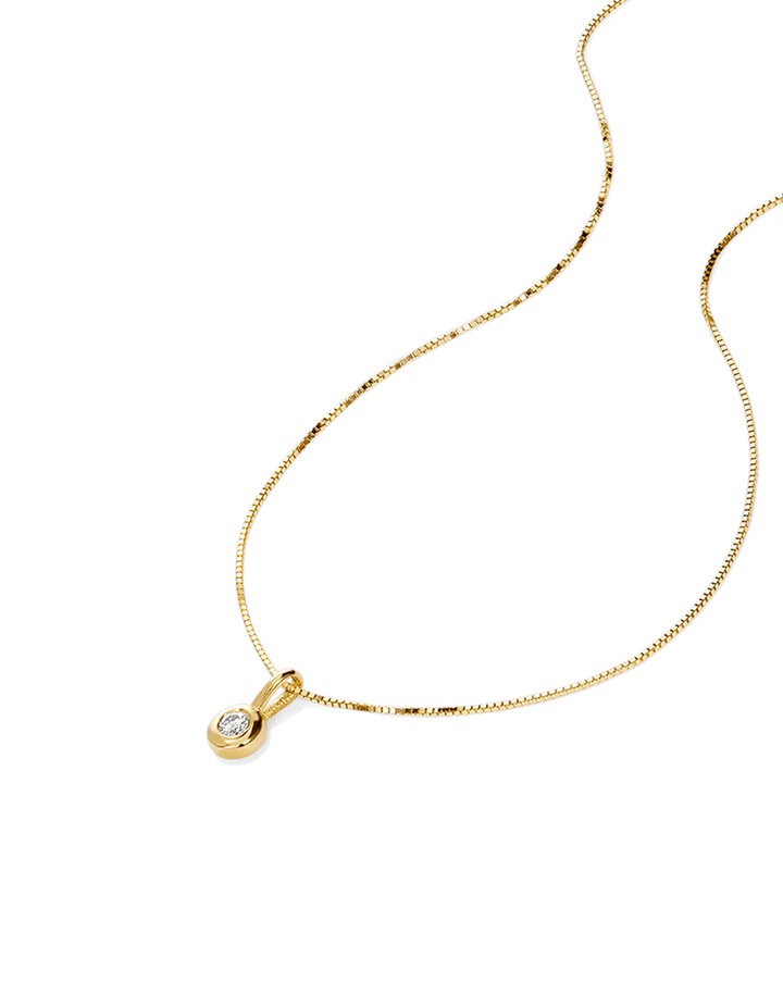 Dazzle with the James Michelle Mini Diamond Drop Necklace! Crafted from 14k solid yellow gold, this chic pendant features a 2mm diamond and a 4mm bezel with diamond, hanging on a delicate .5mm thin box chain for a touch of elegance!