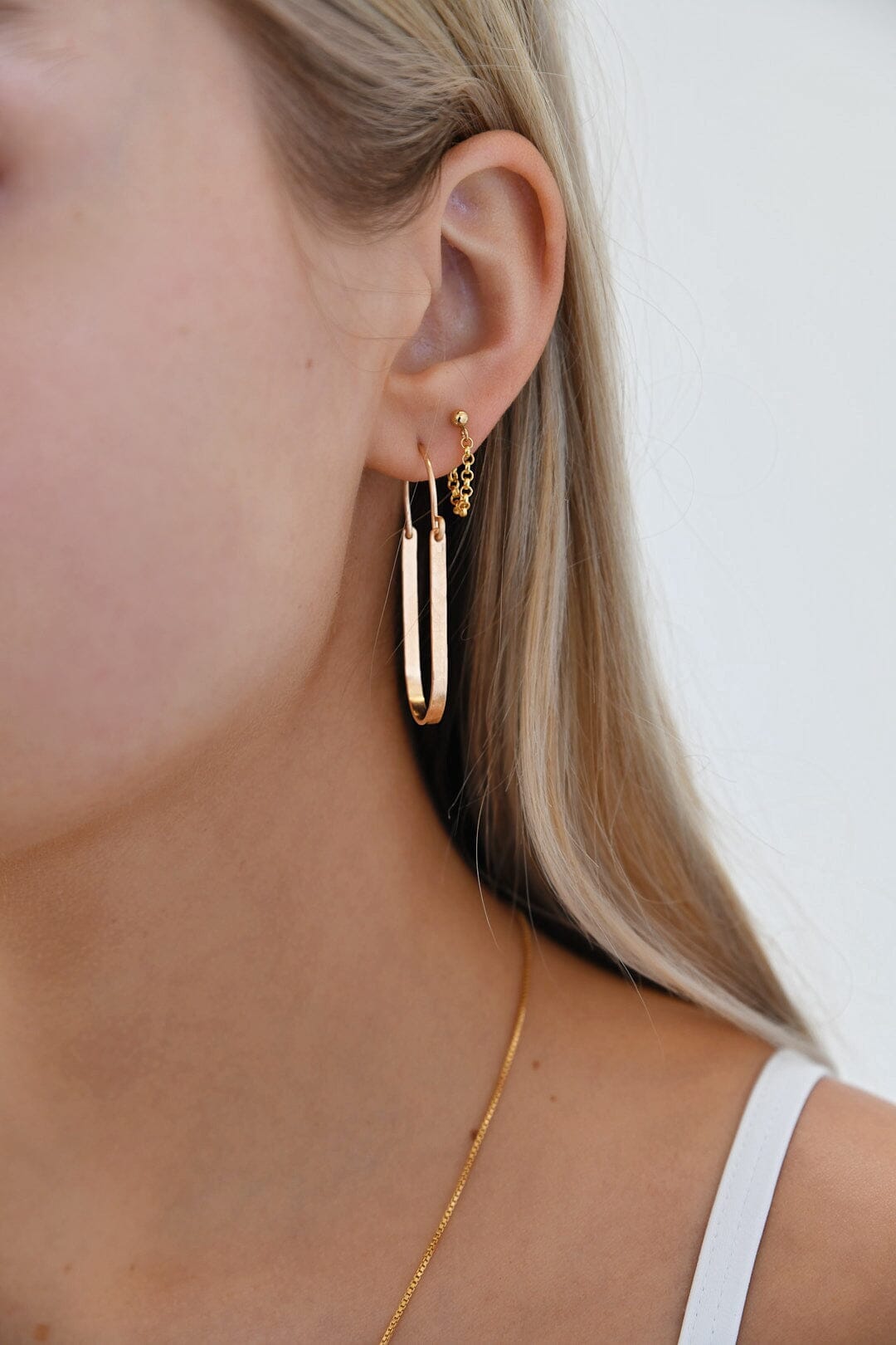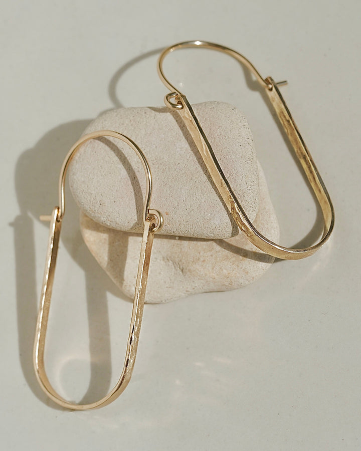 Elevate your accessory game with the James Michelle Lil Bend Hoops! Made from 14k gold fill or sterling silver, these chic hoops measure 44mm x 19mm, adding a trendy touch to your outfit!