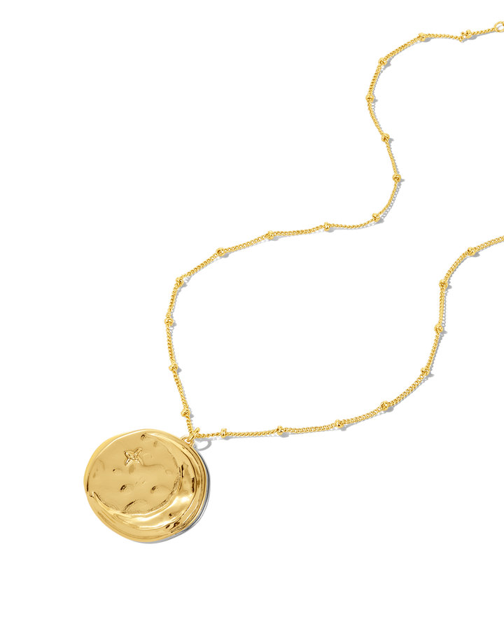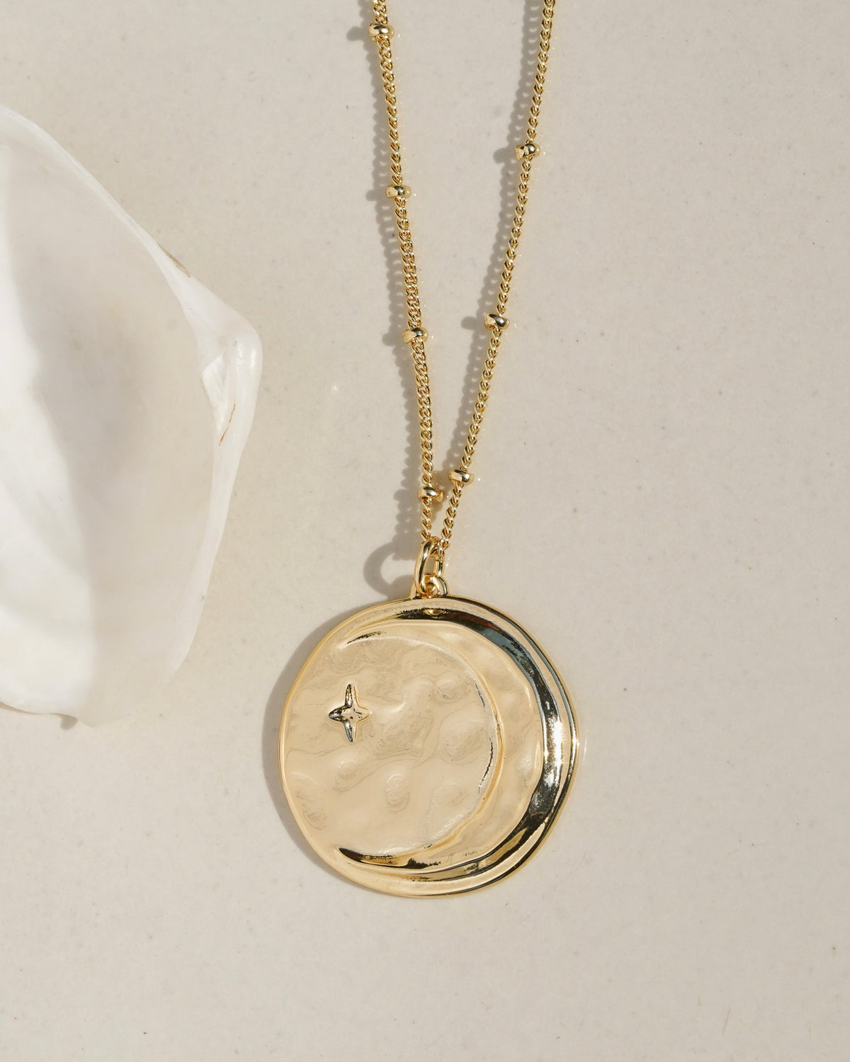 Shine bright with the James Michelle Moonlit Necklace! Crafted from 10k gold plated over brass, this beautiful pendant measures 1' in diameter and hangs on a 1mm satellite chain with an adjustable length of 16' - 18'!