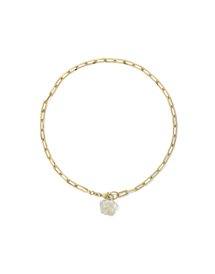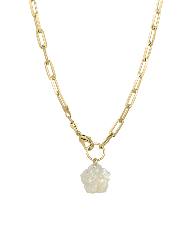 Make a statement with the James Michelle Chunky Pearl Hibiscus Necklace! Crafted from 10k gold plated over brass, this necklace features a stunning 20mm mother of pearl hibiscus pendant on an 18' length, 8mm link chain!