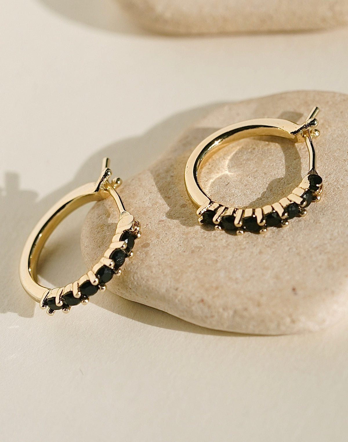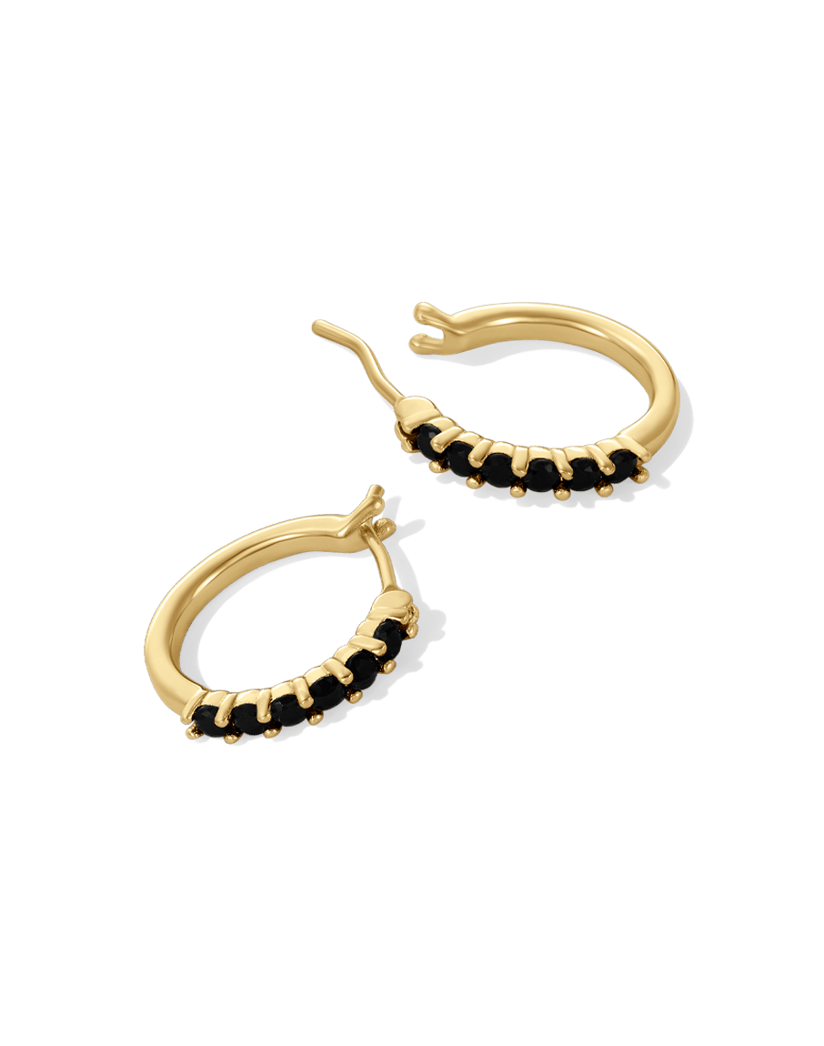 Make a statement with the James Michelle Noir Huggie Hoops! Crafted from 10k gold plated over brass with stainless steel posts, these chic hoops feature black crystals and measure 15mm in diameter, perfect for any occasion!