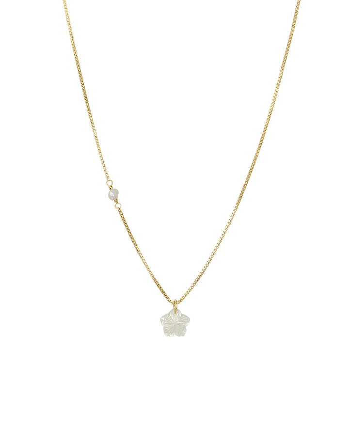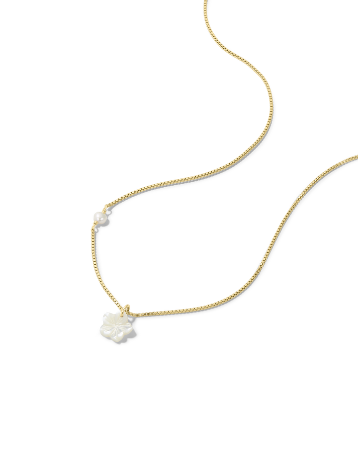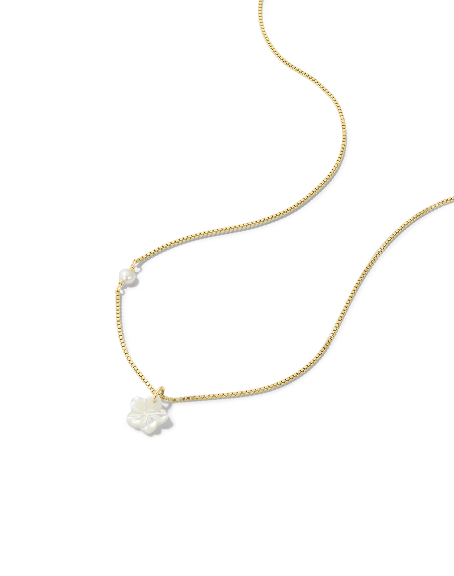 Celebrate island vibes with the James Michelle Pearl Hibiscus Necklace! Made from 14k gold fill, this stunning necklace features a 10mm mother of pearl hibiscus pendant on an 18' length, 1mm box chain!