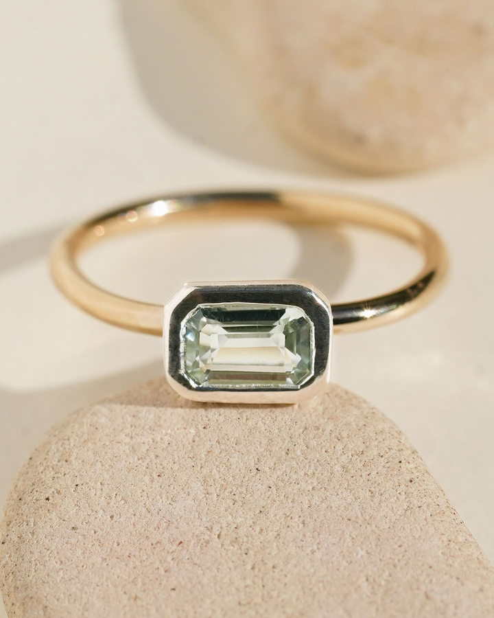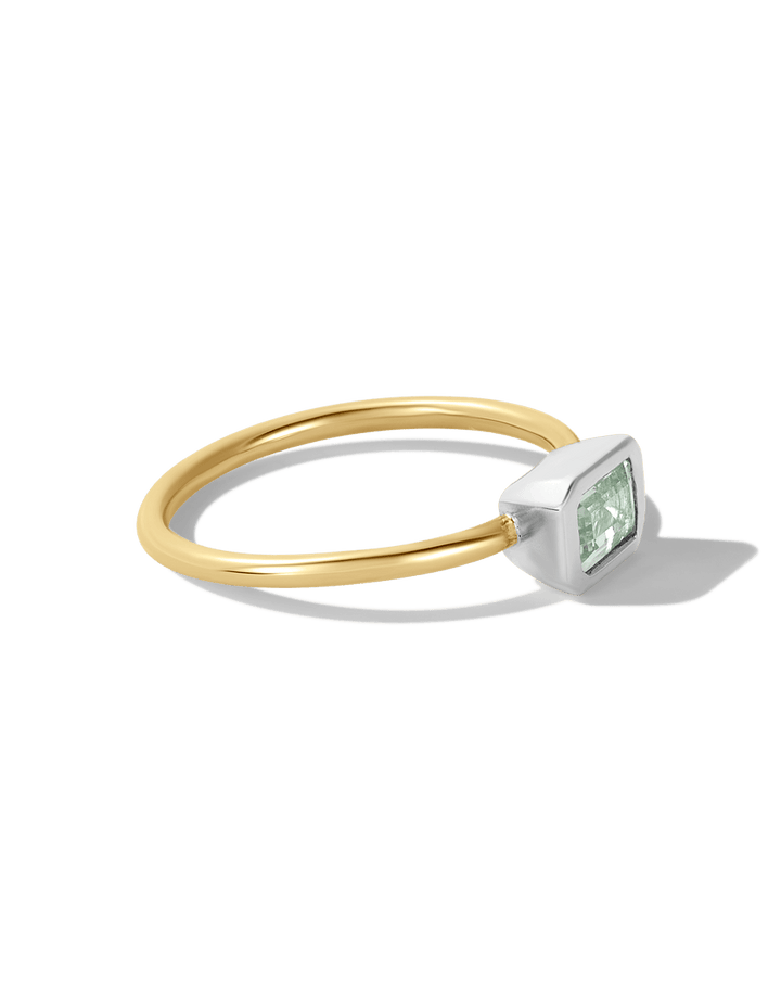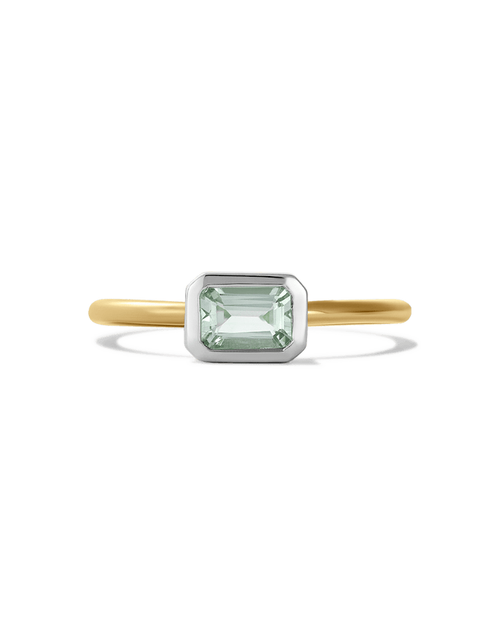 Add a touch of sophistication with the James Michelle Eden Ring! Featuring a stone setting of sterling silver and a band of 14k gold fill, this ring showcases a beautiful emerald cut green amethyst (5mm x 10mm) and measures 7mm x 12mm x 4mm tall at the ring face!