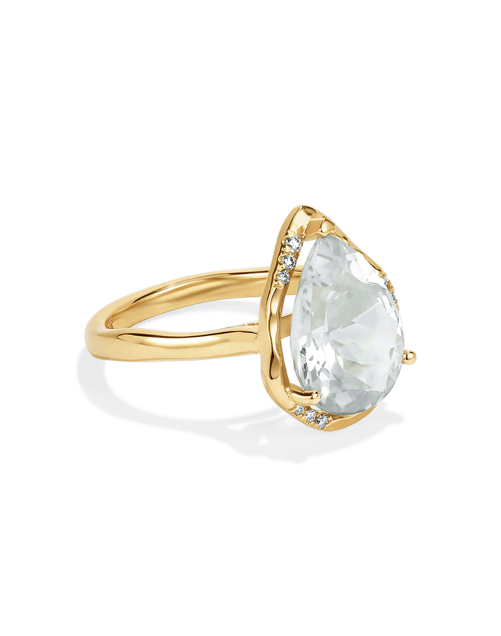 Exude elegance with the James Michelle Azure Goddess Ring! Made from 14k solid yellow or white gold, this ring showcases a stunning green amethyst (14mm x 10mm) and a diamond (G color, SI clarity) for a luxurious finish, measuring 17mm x 13mm at the ring face!