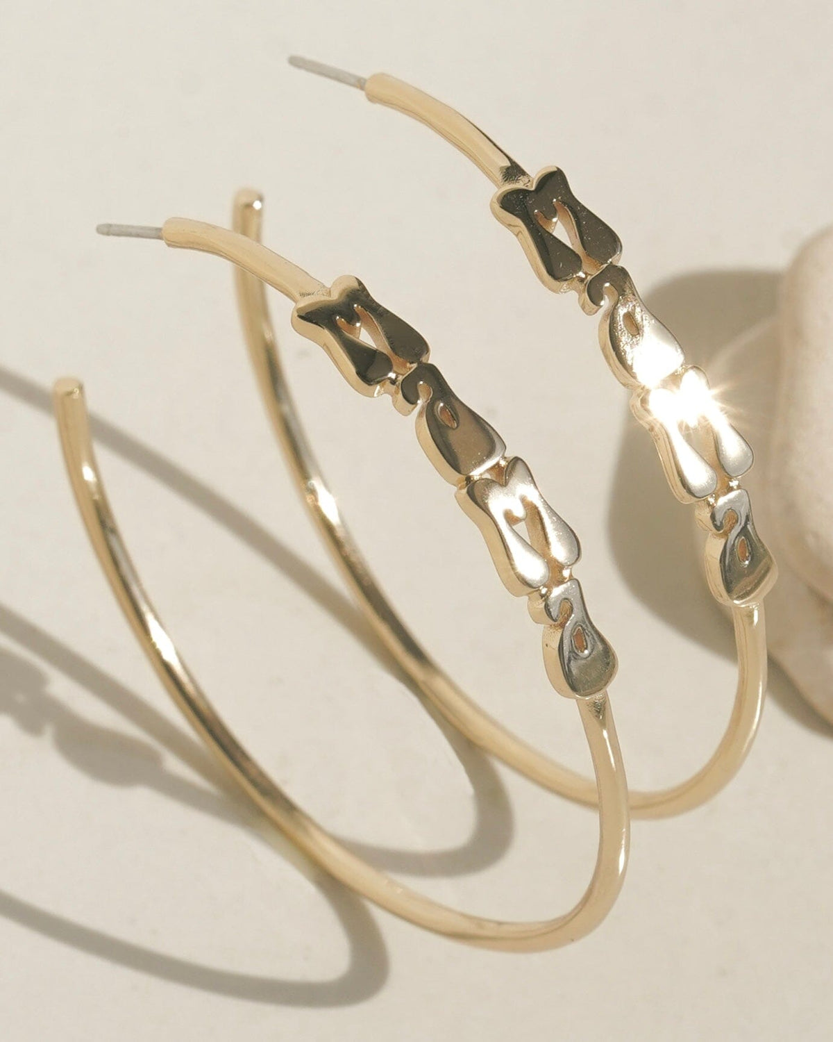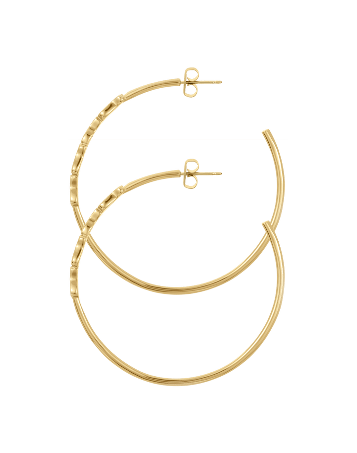 Add a statement piece to your collection with the James Michelle Groovy Mama Hoops! Made from 10k gold plated over brass or silver plated over brass, these large hoops measure 50mm in diameter and are perfect for any occasion!