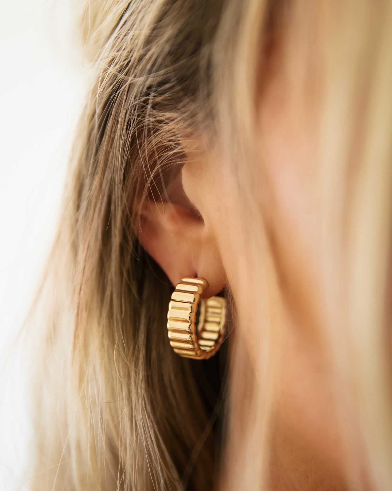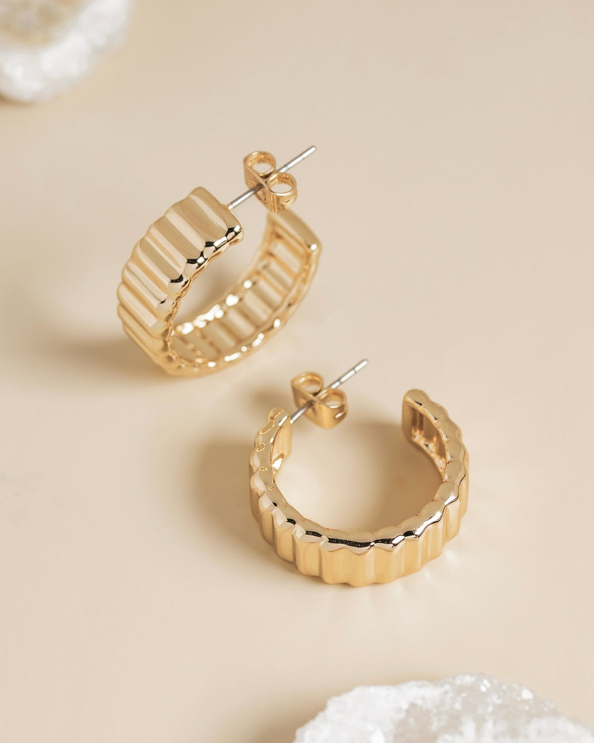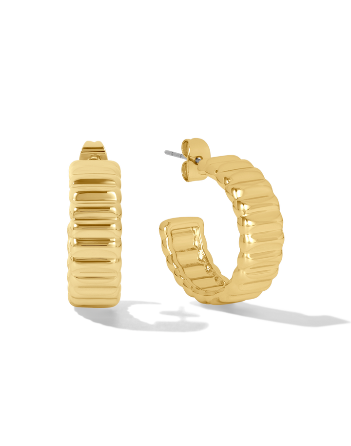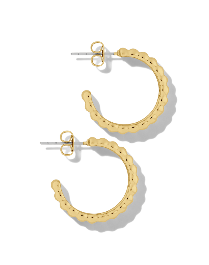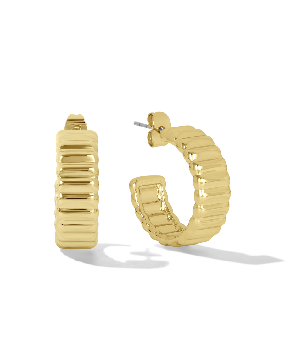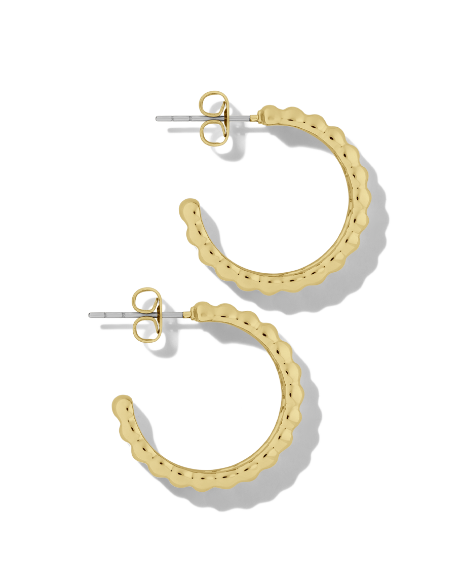 Elevate your accessory game with the James Michelle Eclair Hoops! Crafted from 10k gold plated over brass with stainless steel posts, these chic earrings feature a width of 1/4' and a diameter of 7/8'.