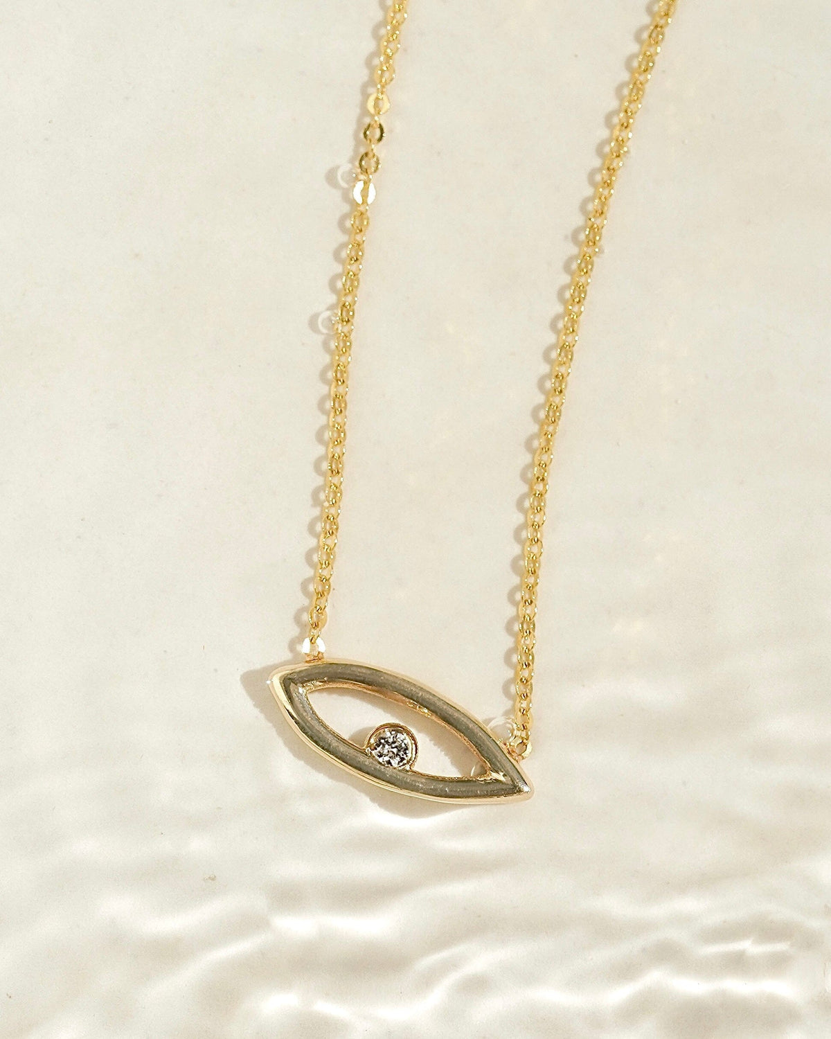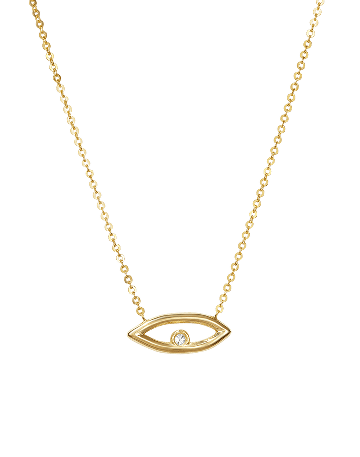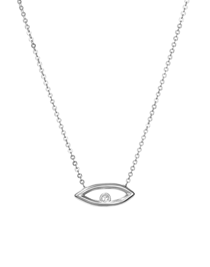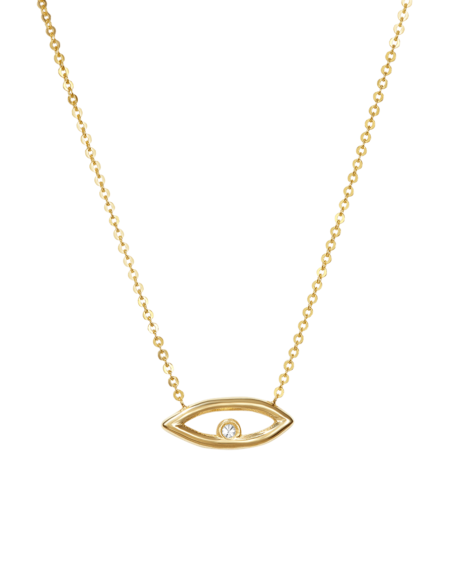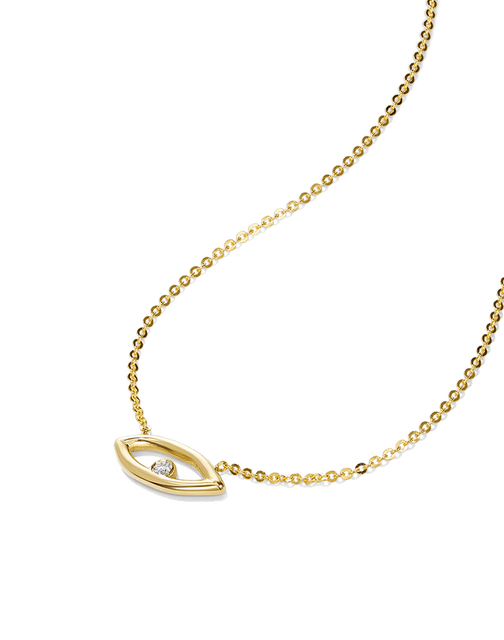 Protect yourself in style with the James Michelle Evil Eye Necklace! Made from 14k solid yellow or white gold, this exquisite pendant measures 1/3' x 1/5' with a bezel and features a 2mm diamond, hanging from a durable cable chain.