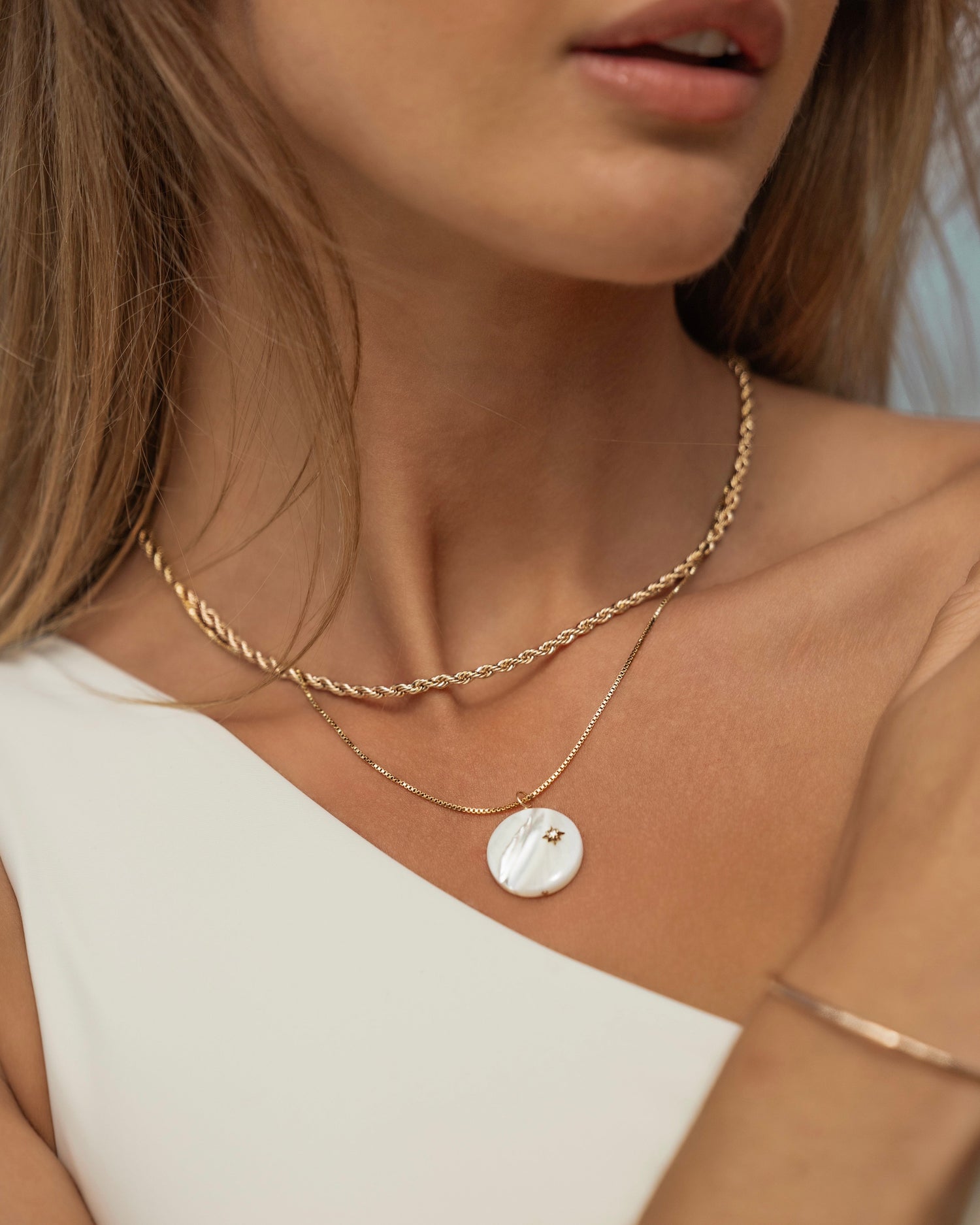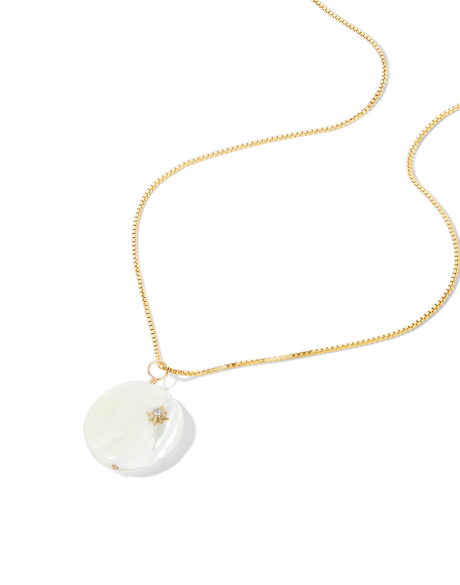 Shine bright with the James Michelle Full Moon Necklace! Crafted from 14k gold fill chain, 10k solid gold setting, and mother of pearl pendant, this stunning piece features a genuine white sapphire (1.2mm diameter) and a pendant measuring 3/4'.