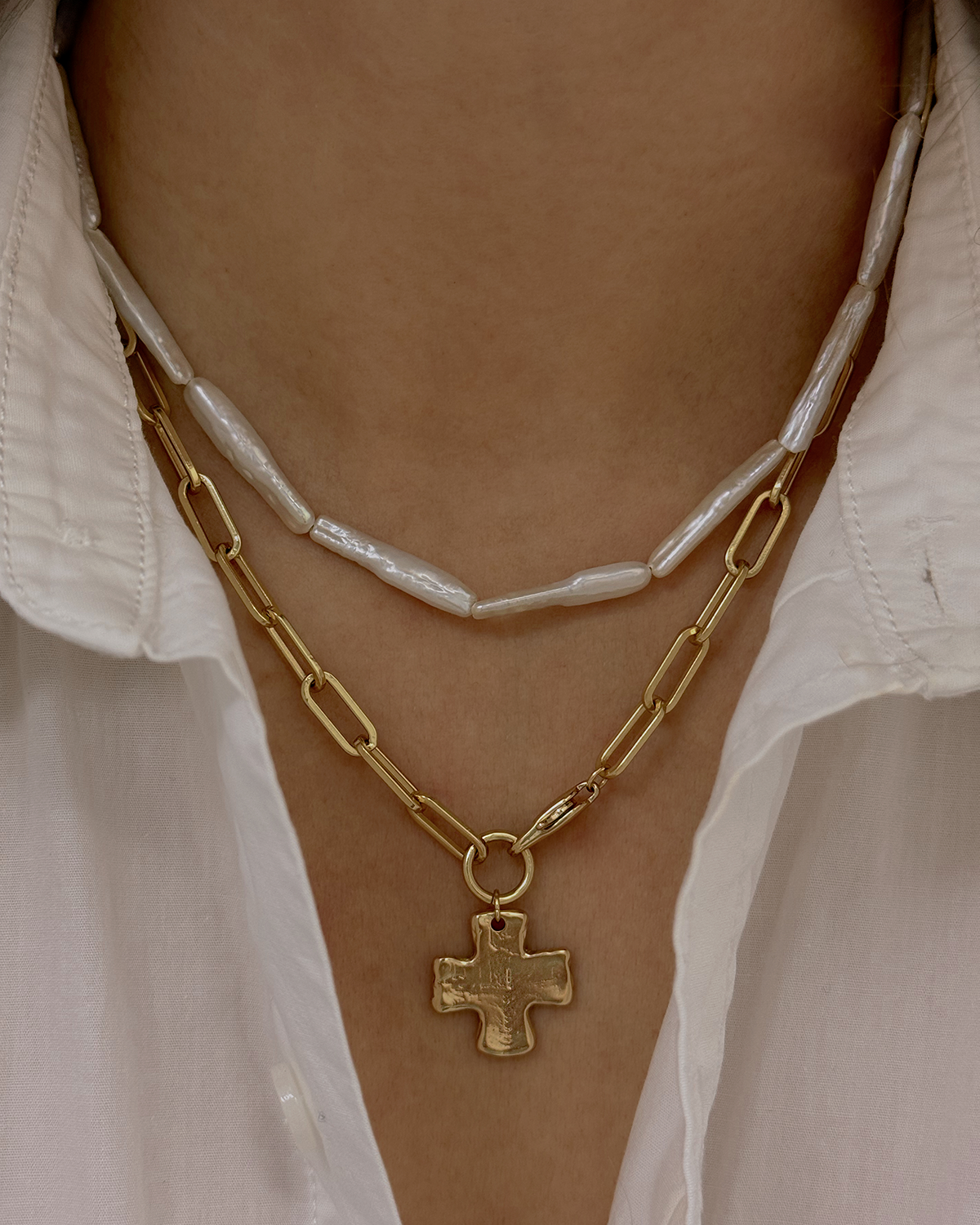 Celebrate timeless beauty with the James Michelle Row of Pearls Necklace! Made from 14k gold fill and freshwater pearls, this elegant piece features a 1' long freshwater pearl pendant and an adjustable chain length of 15'' - 17''.
