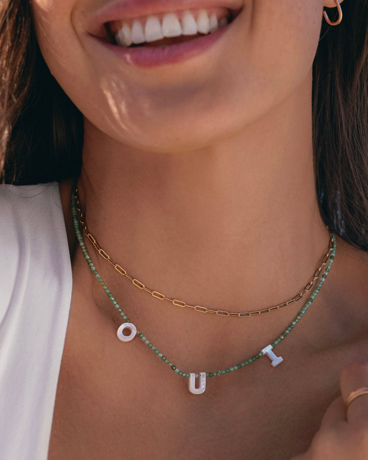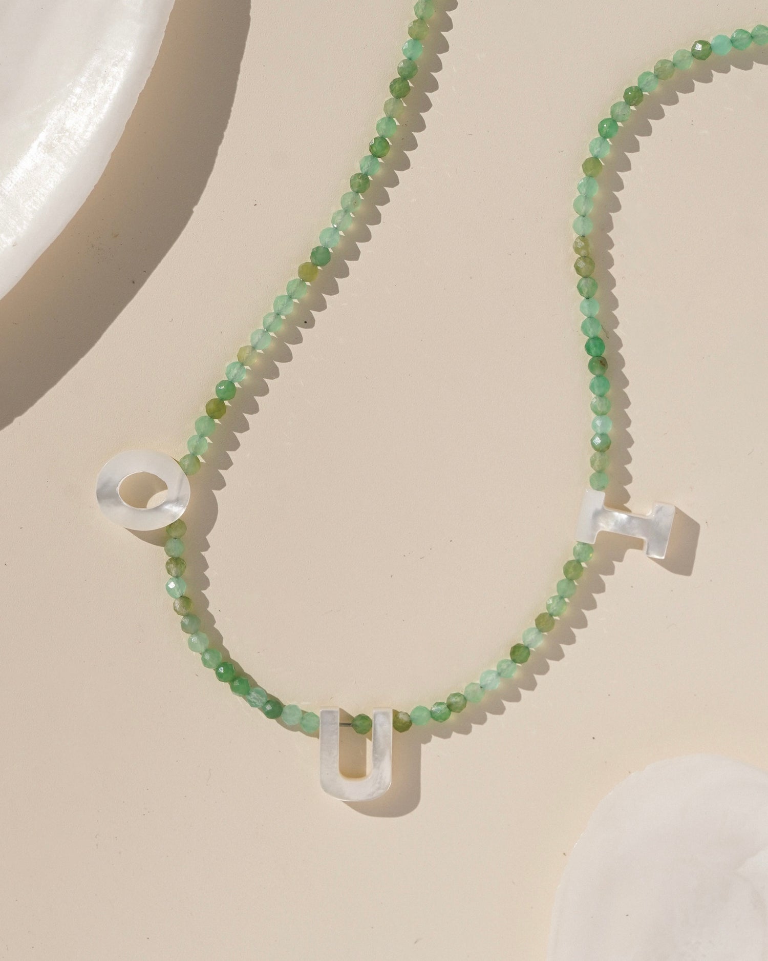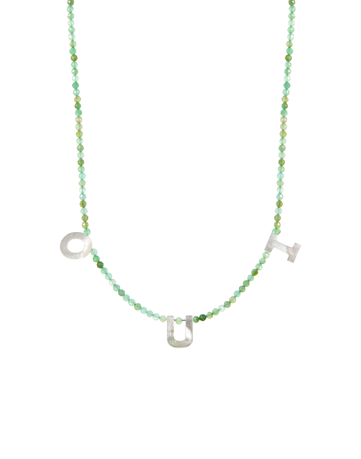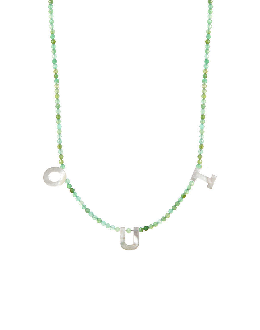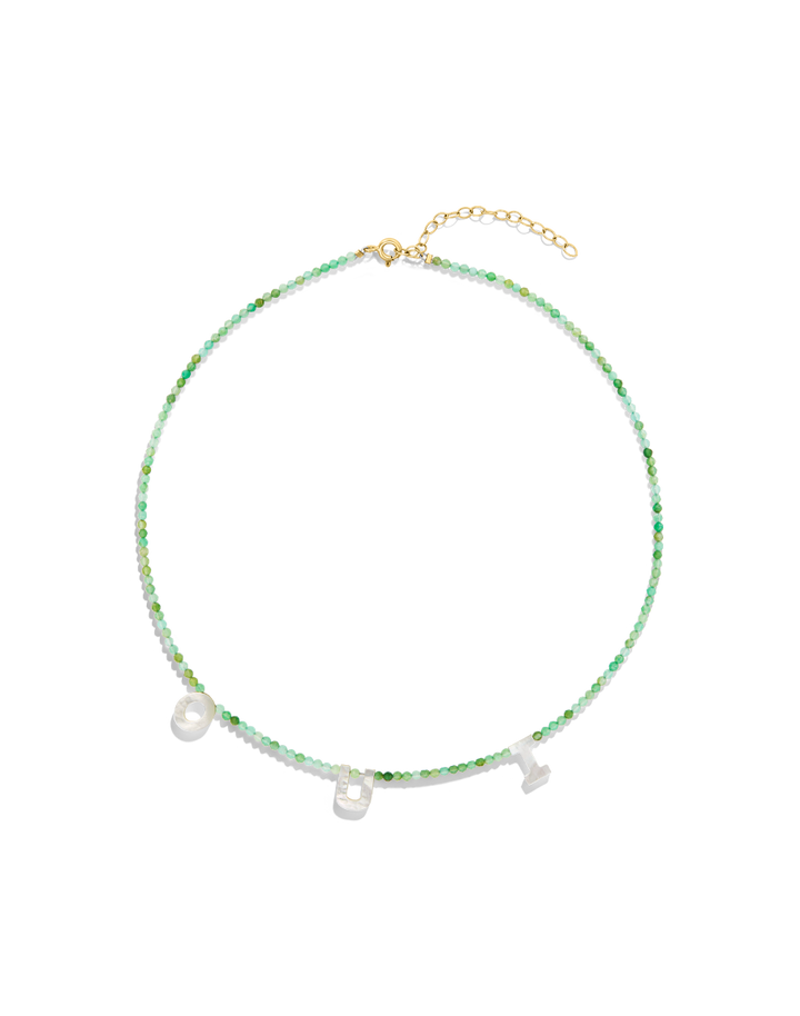 Discover the elegance of the James Michelle Le Paris Beaded Necklace! Featuring green chrysoprase gemstones and mother of pearl letter charms, this stunning necklace has an adjustable length of 14.5' - 17.5', allowing for a customizable fit.