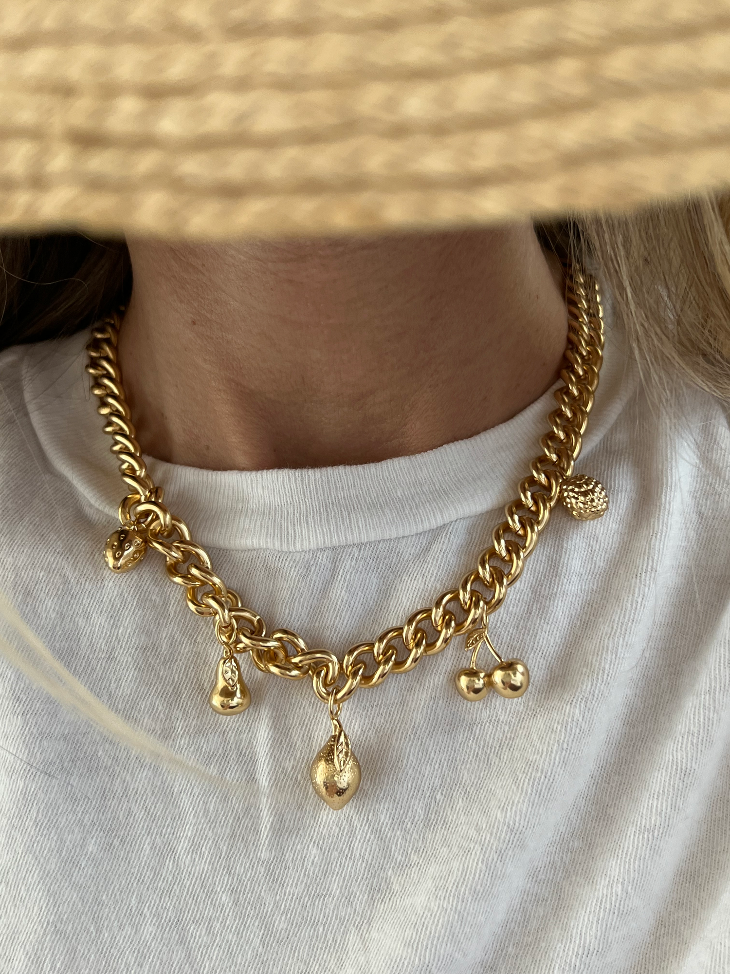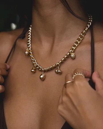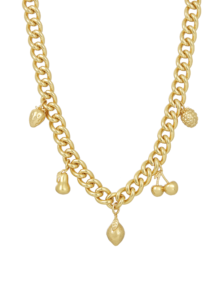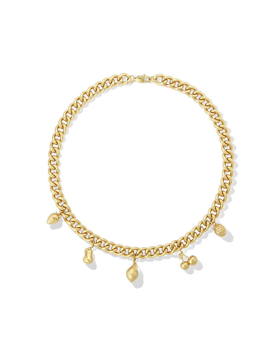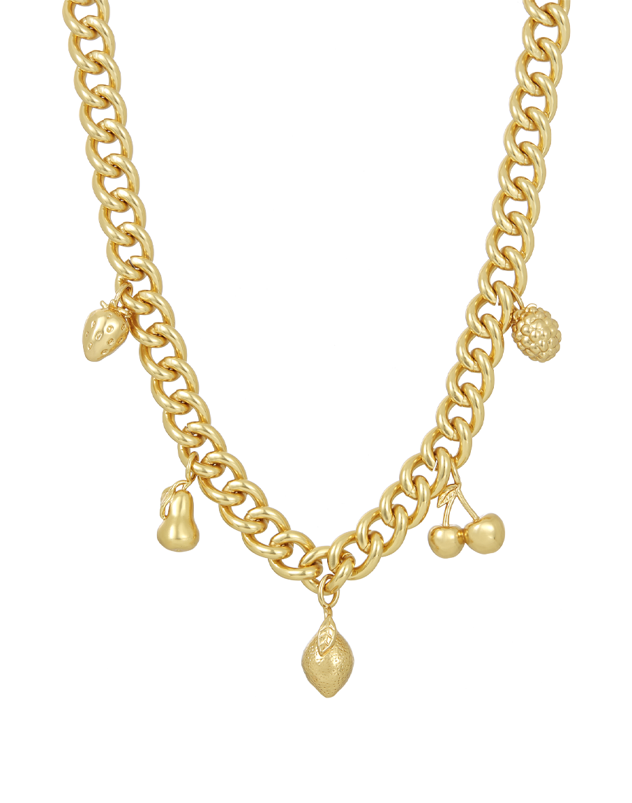 Celebrate summer all year round with the James Michelle Fruit Charm Necklace! Featuring 10k gold plated over brass and a variety of charming pendants (12mm - 18mm), this delightful piece hangs from a sturdy 10mm chain for a playful look.