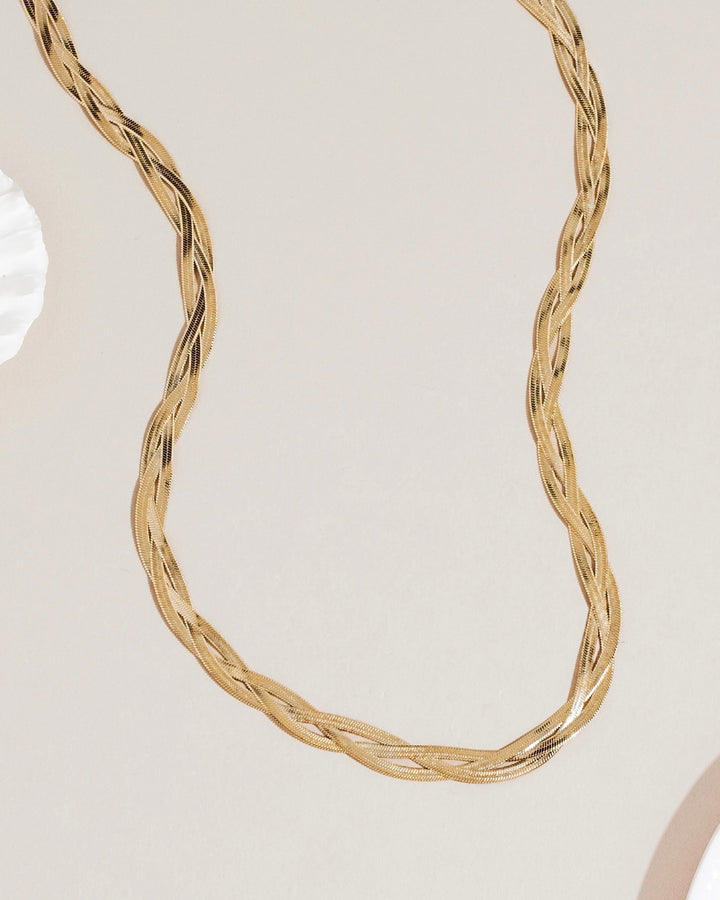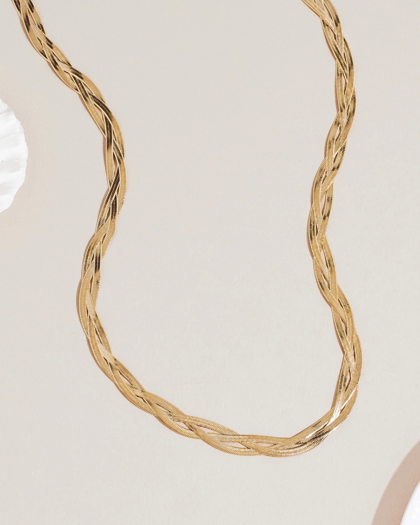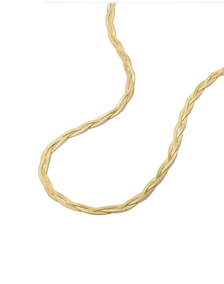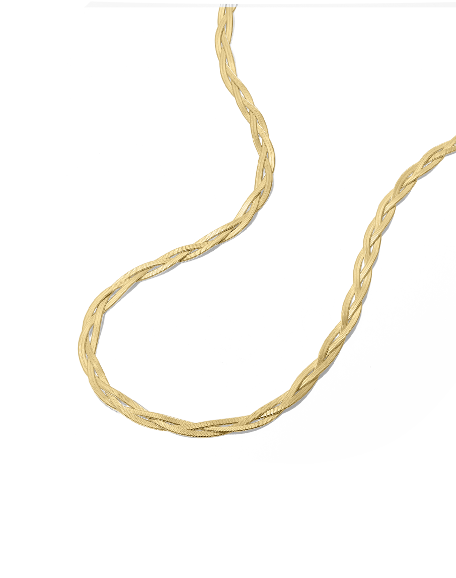 Discover the allure of the James Michelle Braided Snake Chain! Made from 12k gold plated over brass, this elegant chain measures 1/4' in width and is adjustable in length from 16' to 20', making it a versatile addition to any jewelry collection.