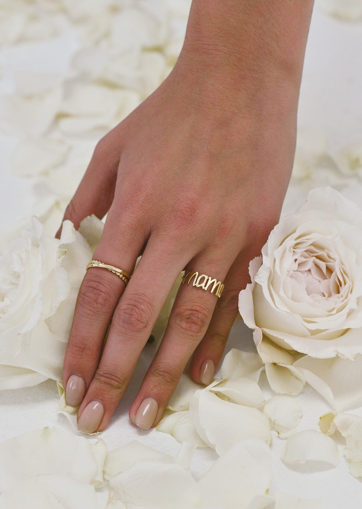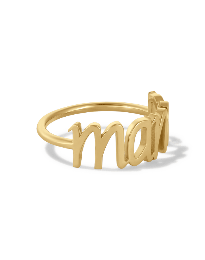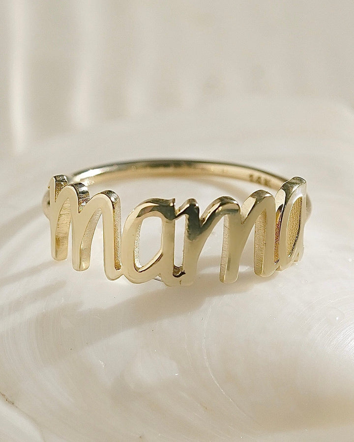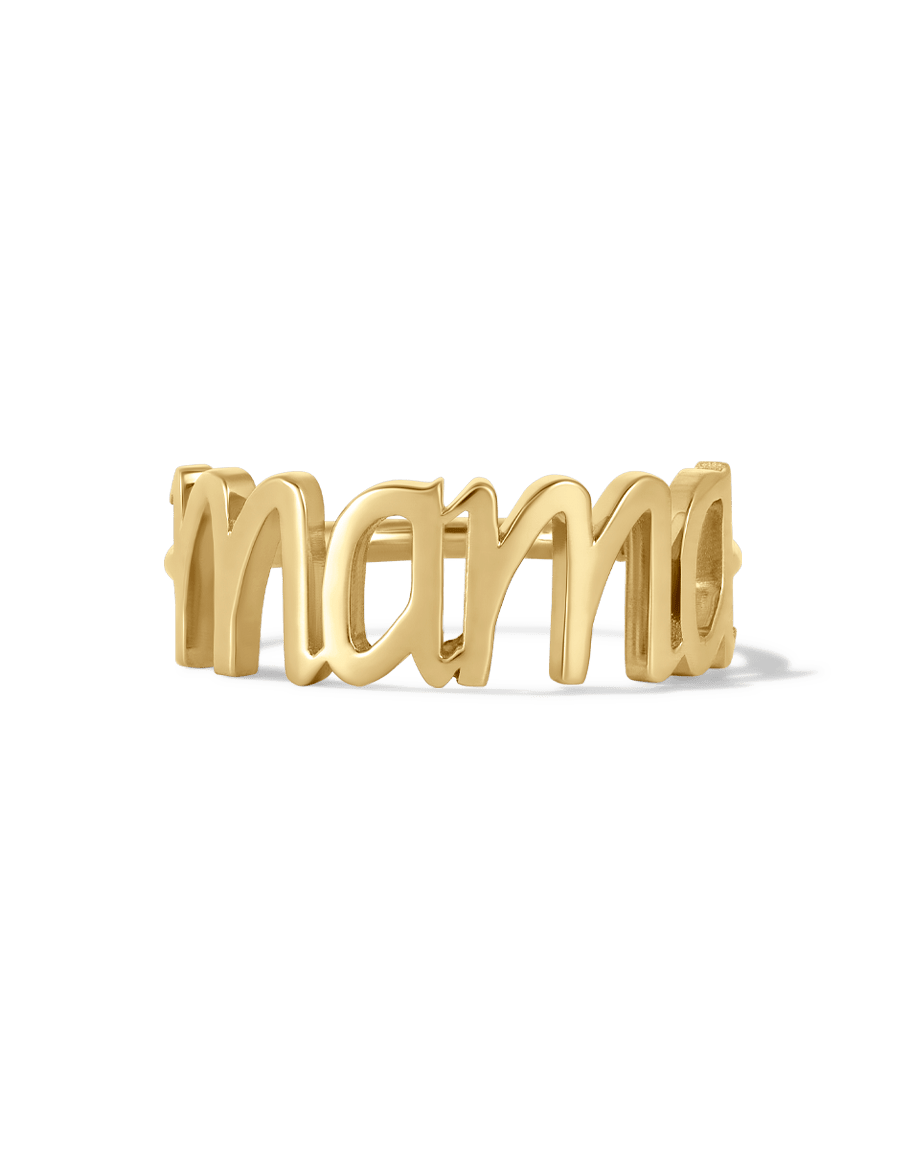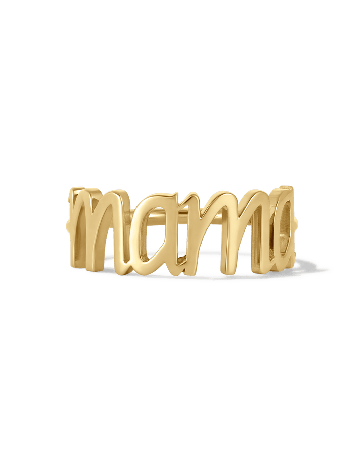 Celebrate love with the James Michelle Solid Gold Mama Ring! Crafted from 14k solid yellow gold, this elegant ring features a delicate face measuring 1/4' x 3/4', making it a meaningful gift for moms.