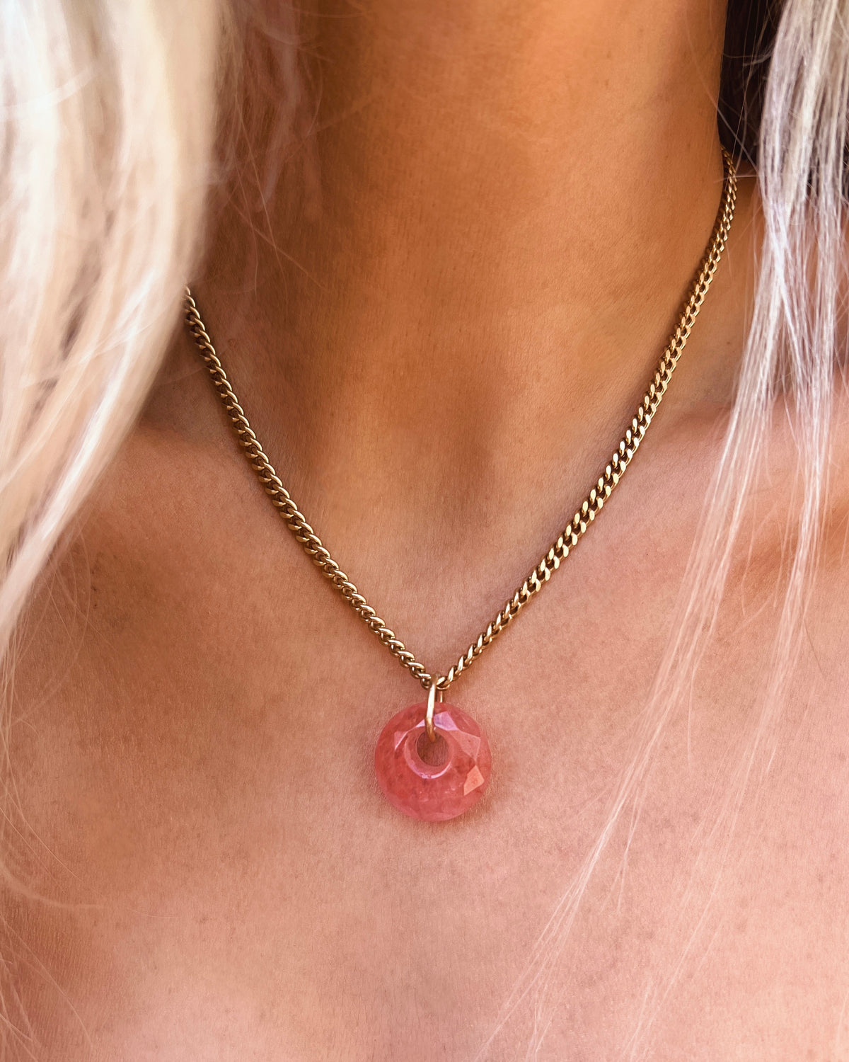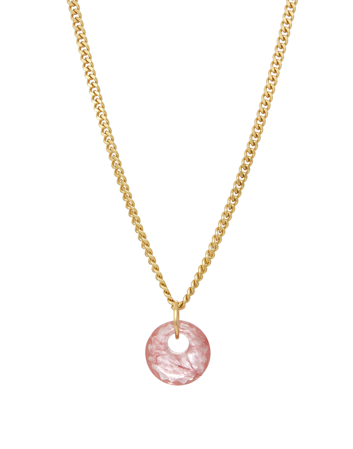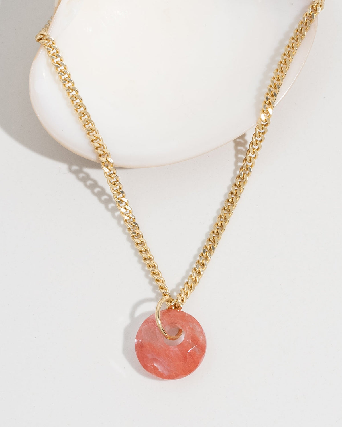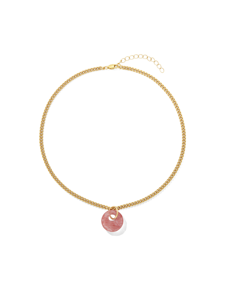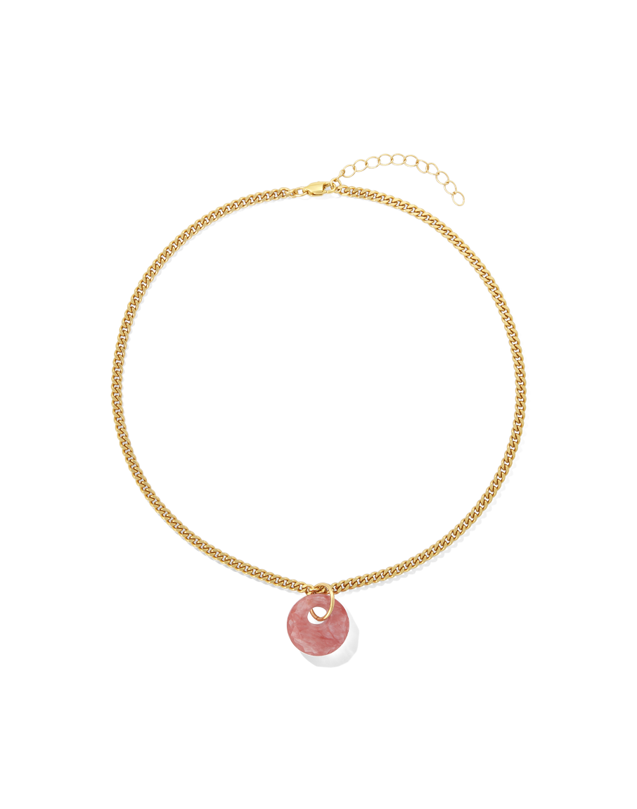 Shine with the James Michelle Gemma Necklace! Made from 12K gold plated over brass and featuring a stunning cherry quartz pendant (20x20x8.6mm), this adjustable 16' - 18' necklace is a must-have for any jewelry lover.