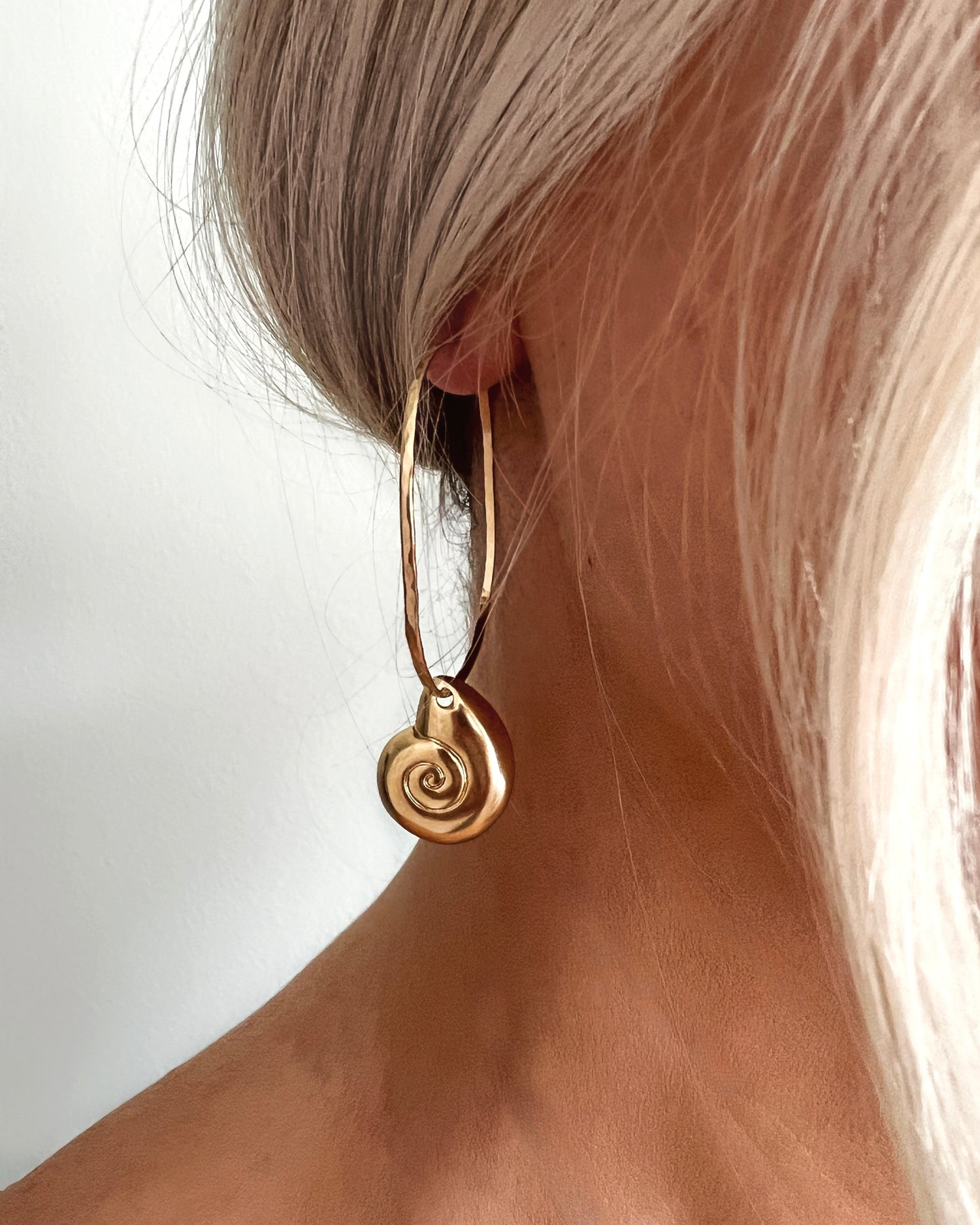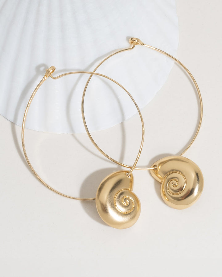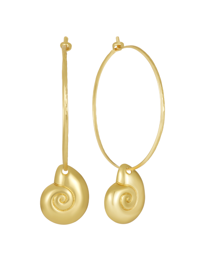Embrace ocean elegance with the James Michelle Nautilus Hoops! Crafted from 12k gold plated over brass, these hoops measure 40mm with a 20mm shell pendant, offering a total drop length of 2.5'.