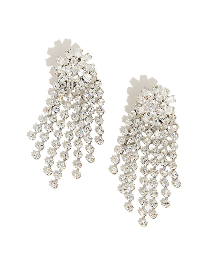 Handcrafted with hand-set crystal stones and a shiny silver finish over brass. Features clip-on earring backs. Measures: 3.25" drop. Arrives in a Loren Hope signature dust bag.