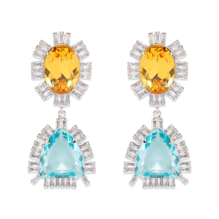 These Everett Drop Earrings by Loren Hope — Classic and colorful, these two-stone drops feature aqua and light topaz crystals accented by baguettes. Perfect for both formal events and casual styling.