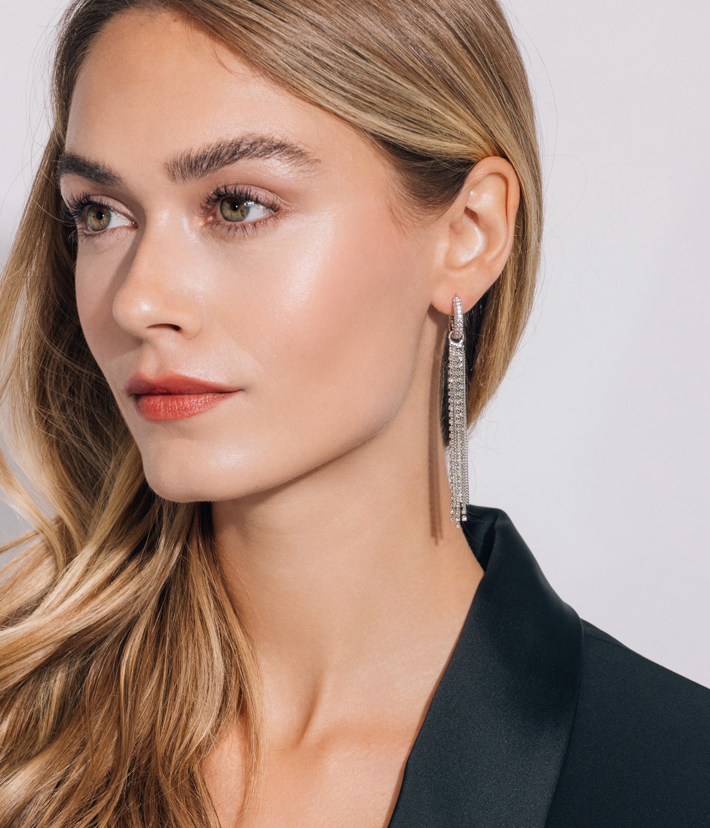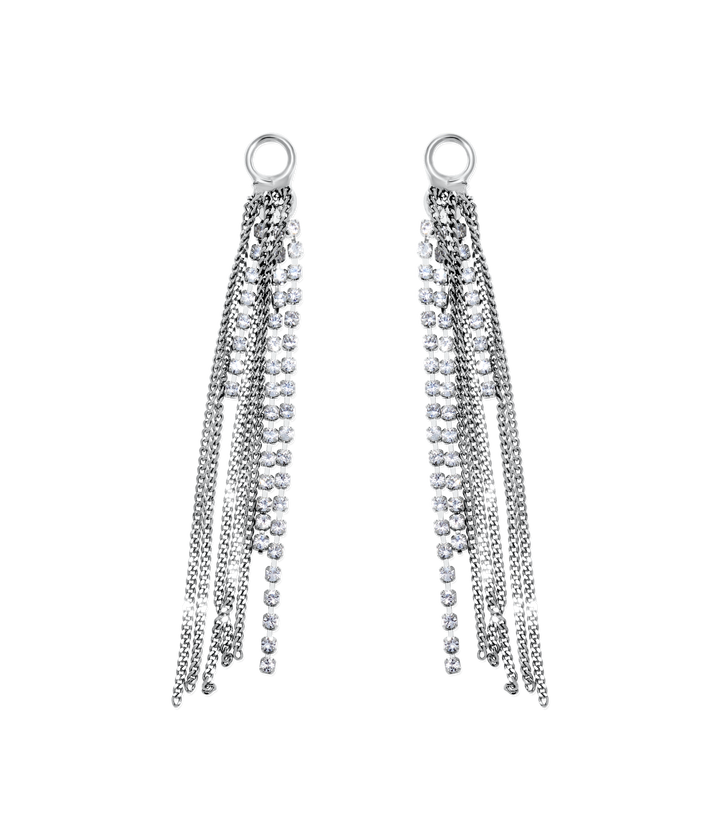 Silver finish over brass with a mix of crystal and chain strands. Measures: 2.5" drop x 0.25". Arrives in a Loren Hope signature dust bag.