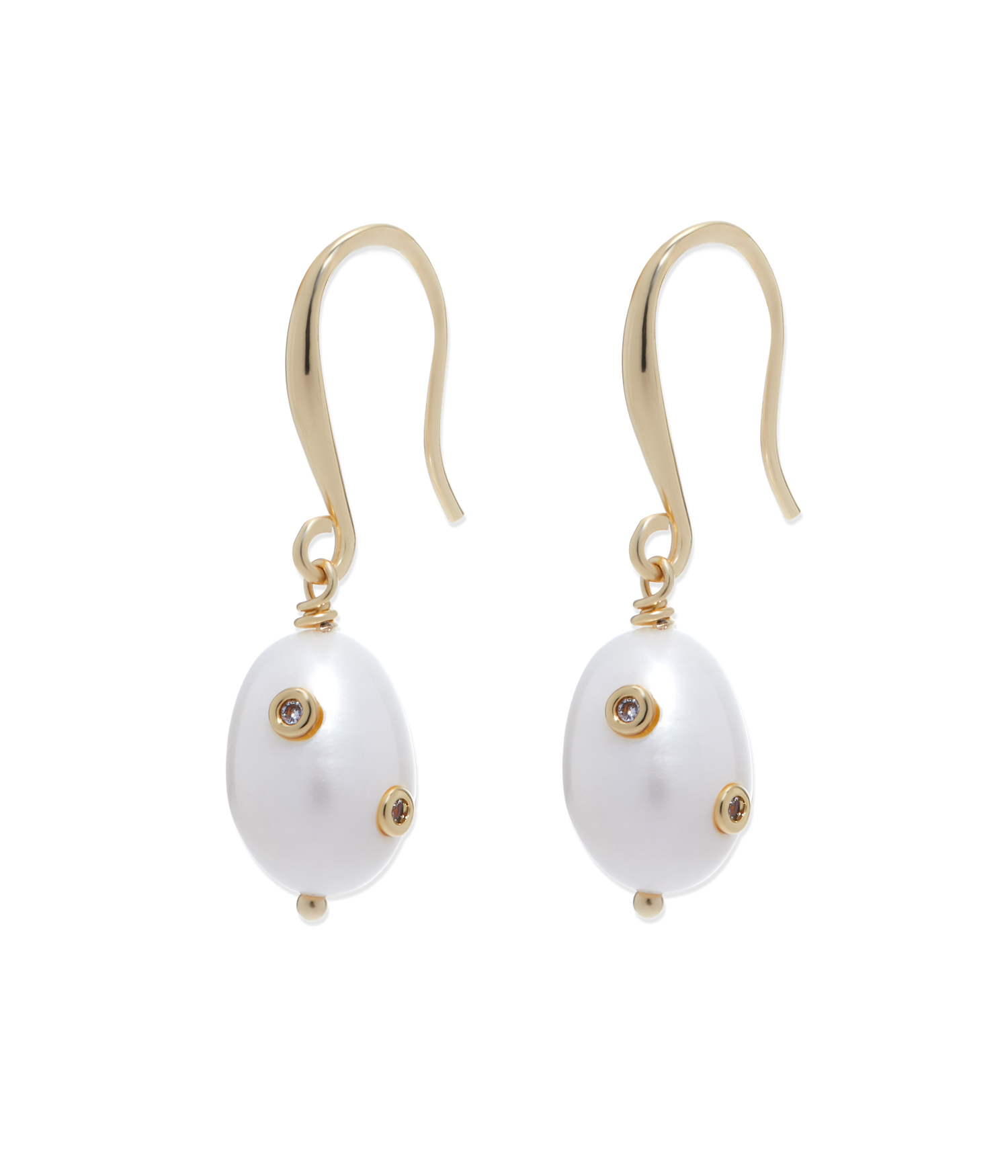 Handcrafted in 24K shiny gold finish over brass, featuring freshwater baroque pearls and CZ stones. Measures 1.5' drop x 0.25' with a delicate fish hook ear wire.
