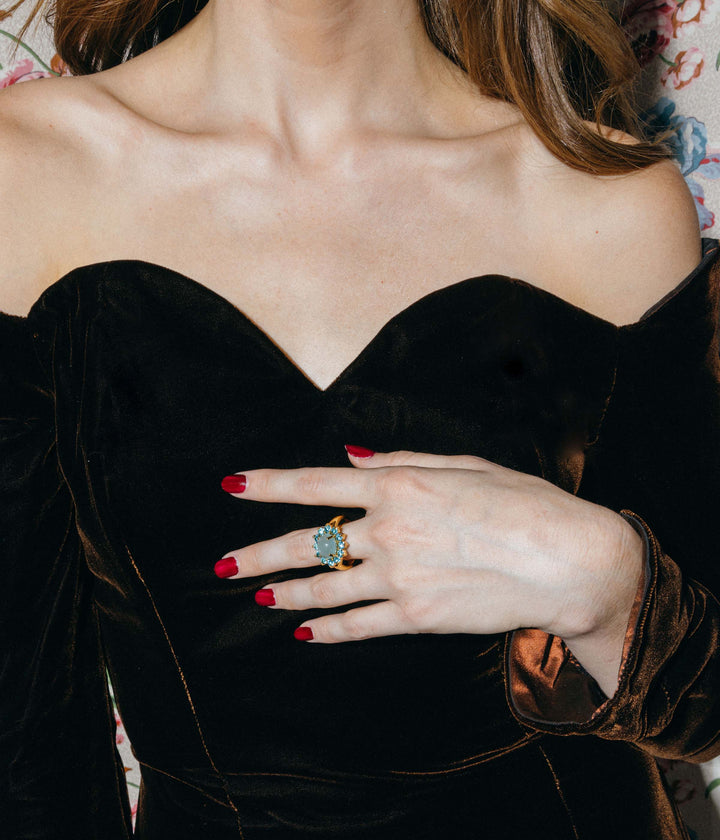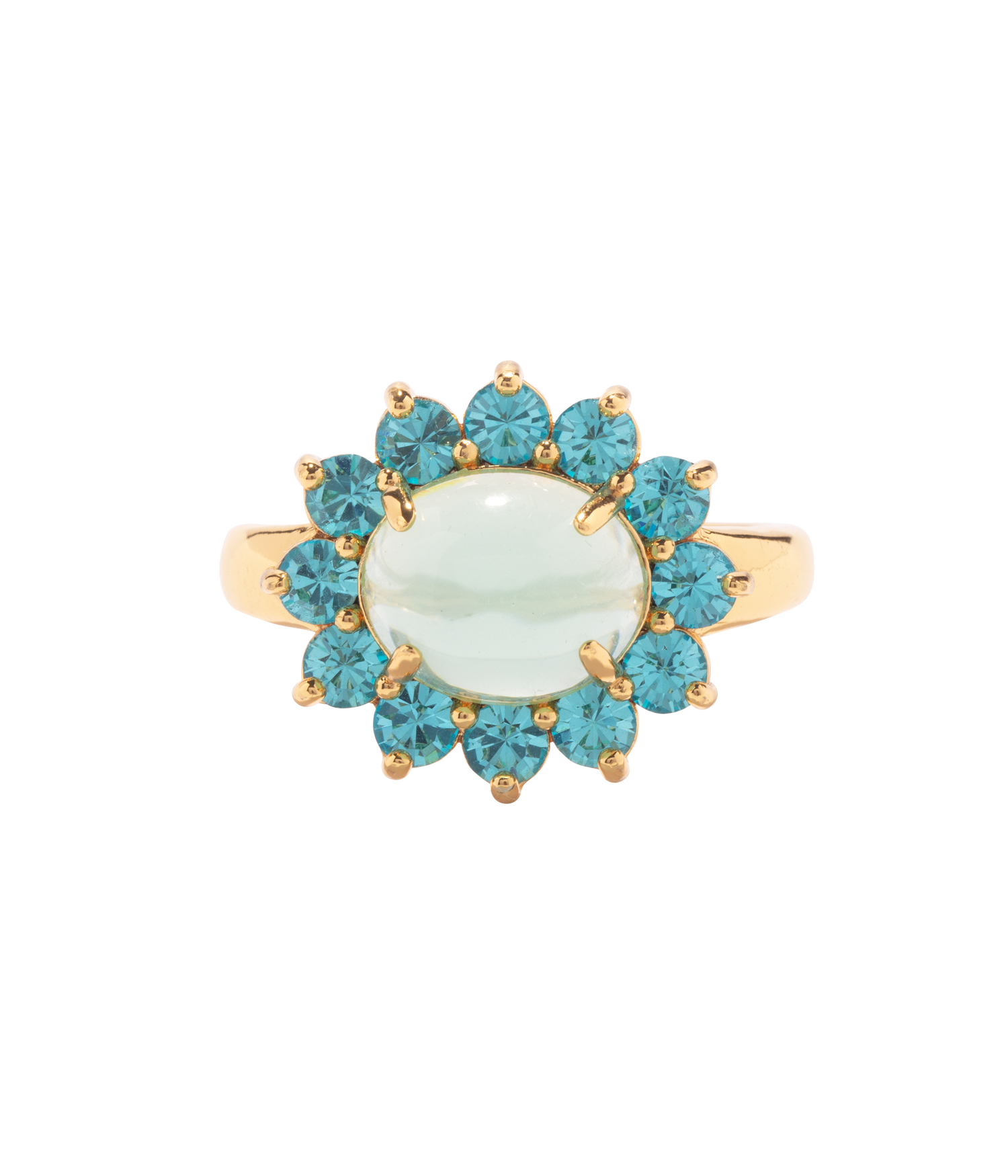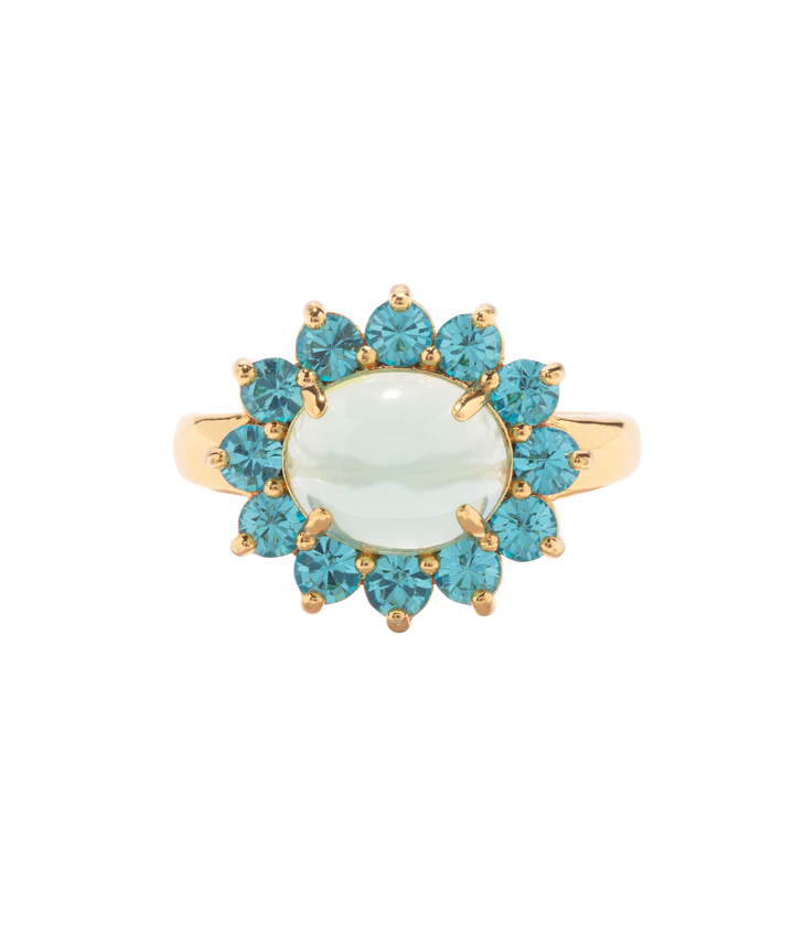 This Georgie Ring in Aqua by Loren Hope is a darling addition to the Georgie suite, offering a bold and beautiful pop of color. The cabochon centerpiece is framed by a halo of coordinating crystals, making it perfect for stacking and mixing with other pieces like the Georgie Stud Earrings or Drop Earrings for a fresh take on a classic jewelry set.