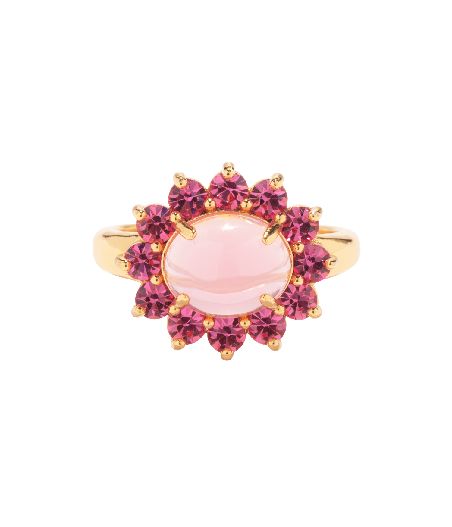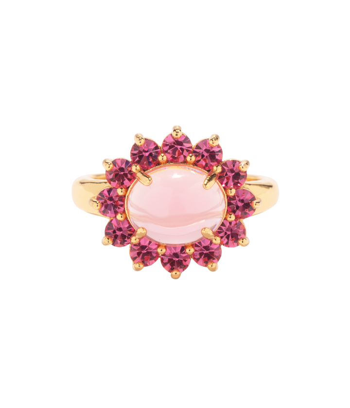 This Georgie Ring in Pink by Loren Hope is a charming and playful addition to any jewelry collection. Featuring a vibrant pink cabochon surrounded by a halo of coordinating crystals, this cocktail ring is perfect for stacking with other pieces from the Georgie suite, such as the Georgie Stud or Drop Earrings. Ideal for adding a pop of color to your outfit, whether casual or formal.