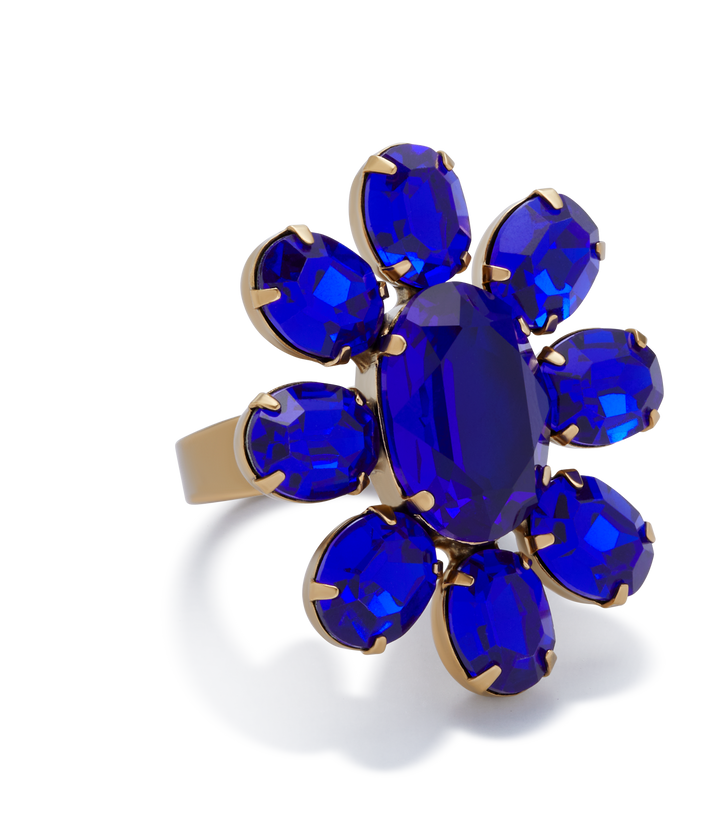 The Indigo Cocktail Ring by Loren Hope is designed for celebrations, featuring a stunning floral motif of vibrant cobalt blue crystals. This eye-catching statement piece will add a touch of glamour to any outfit, making it the perfect accessory for special occasions or nights out.