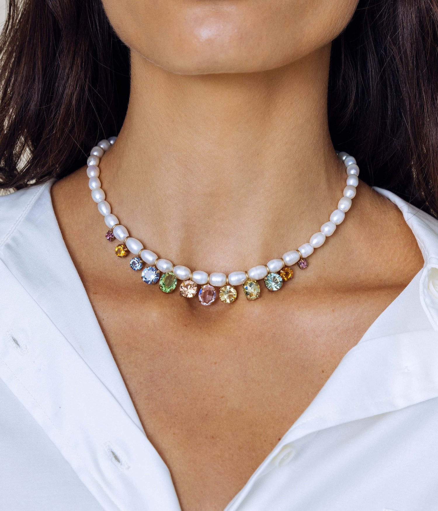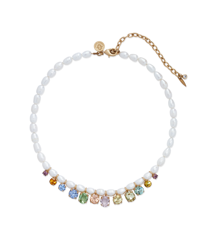 Handcrafted with hand-set glass stones, freshwater pearls, and an 18K gold finish over brass. Measures 15.5" with a 3.5" extender. Ships in a signature Loren Hope dust bag.