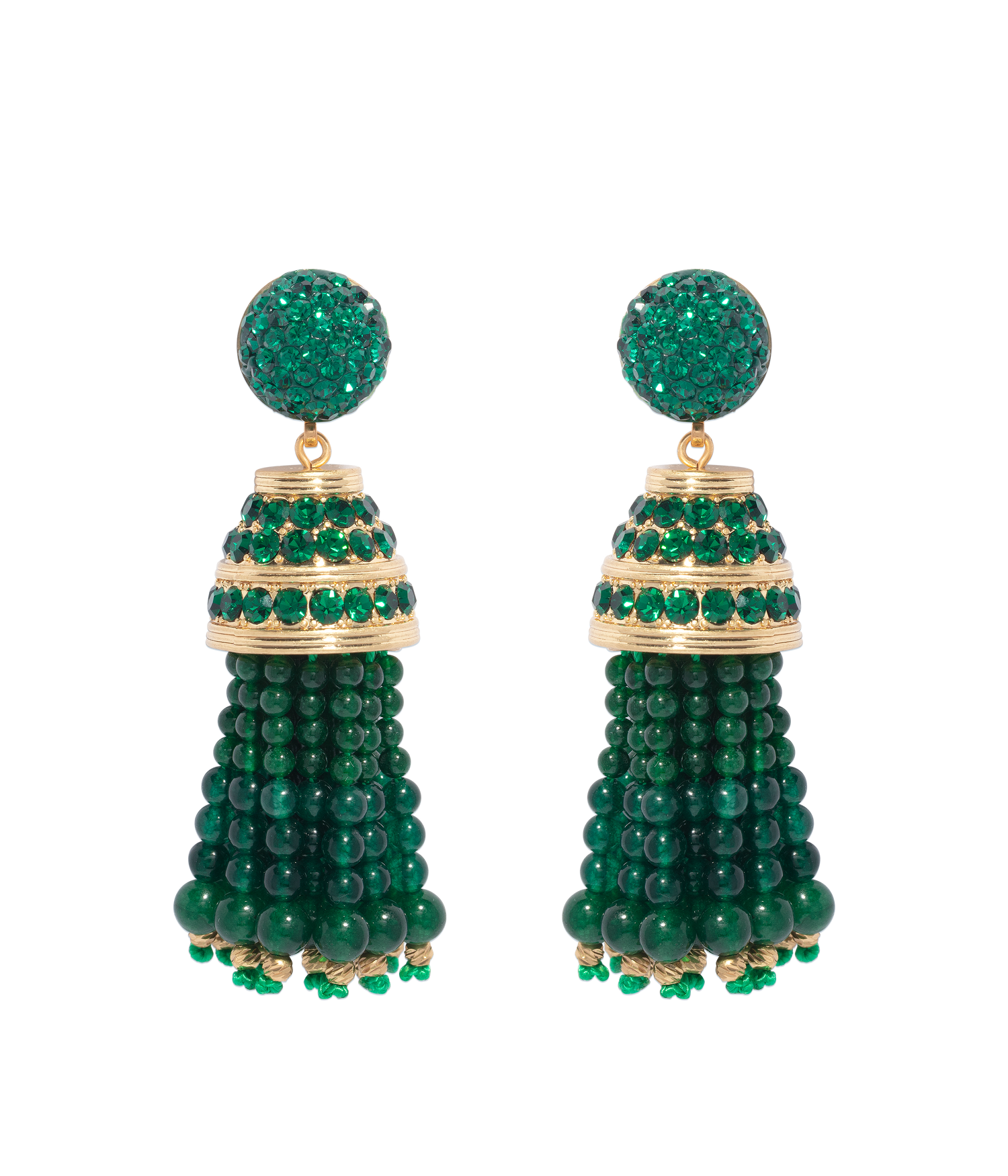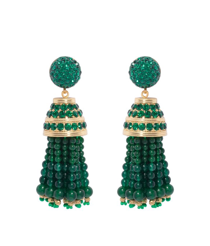 The Jacqueline Statement Earrings by Loren Hope are the perfect tassel-inspired accessory for the season. In a stunning emerald green, these earrings feature playful beaded strands and pavé crystals, complemented by polished brass for a timeless yet fun design. Pair them with the matching Jacqueline Pendant for a coordinated, show-stopping look.