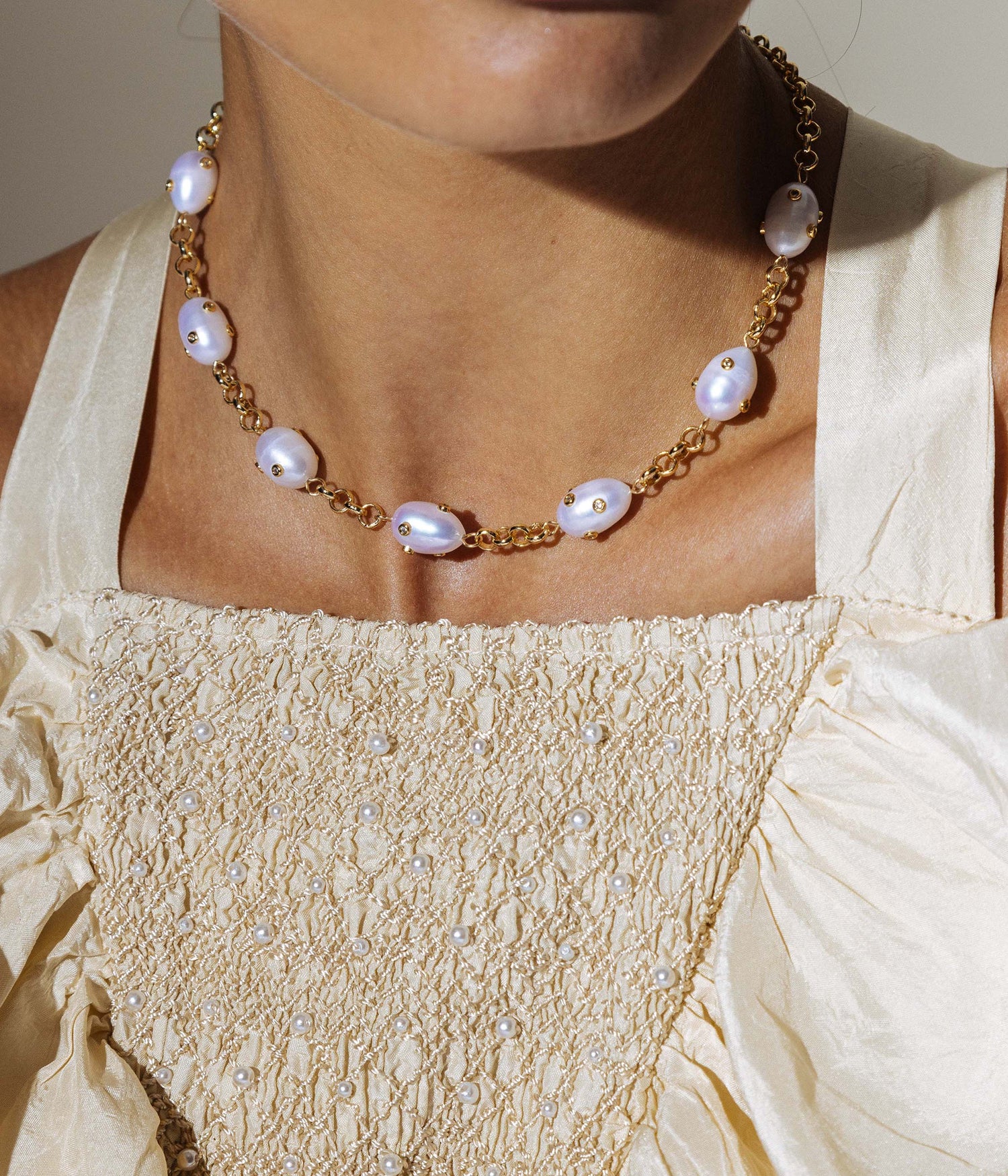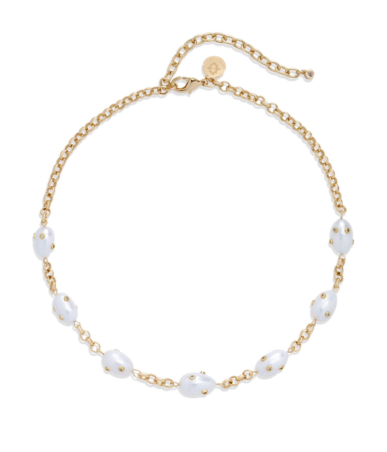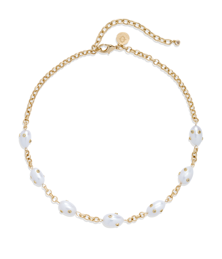 Handcrafted with freshwater pearls inlaid with CZ stones and a 24K shiny gold finish over brass. Measures 15.5' with a 3.0' extender. Ships in a signature Loren Hope dust bag.
