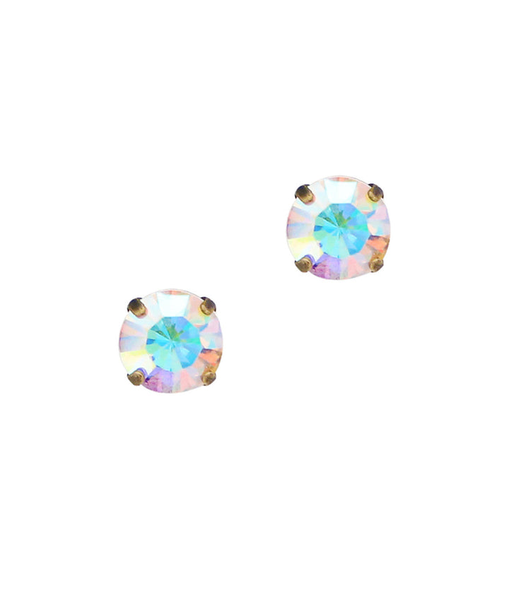 Handcrafted with 18K antiqued gold finish over brass, featuring hand-set crystal stones. Measures 10.5-11 mm each with surgical steel posts.
