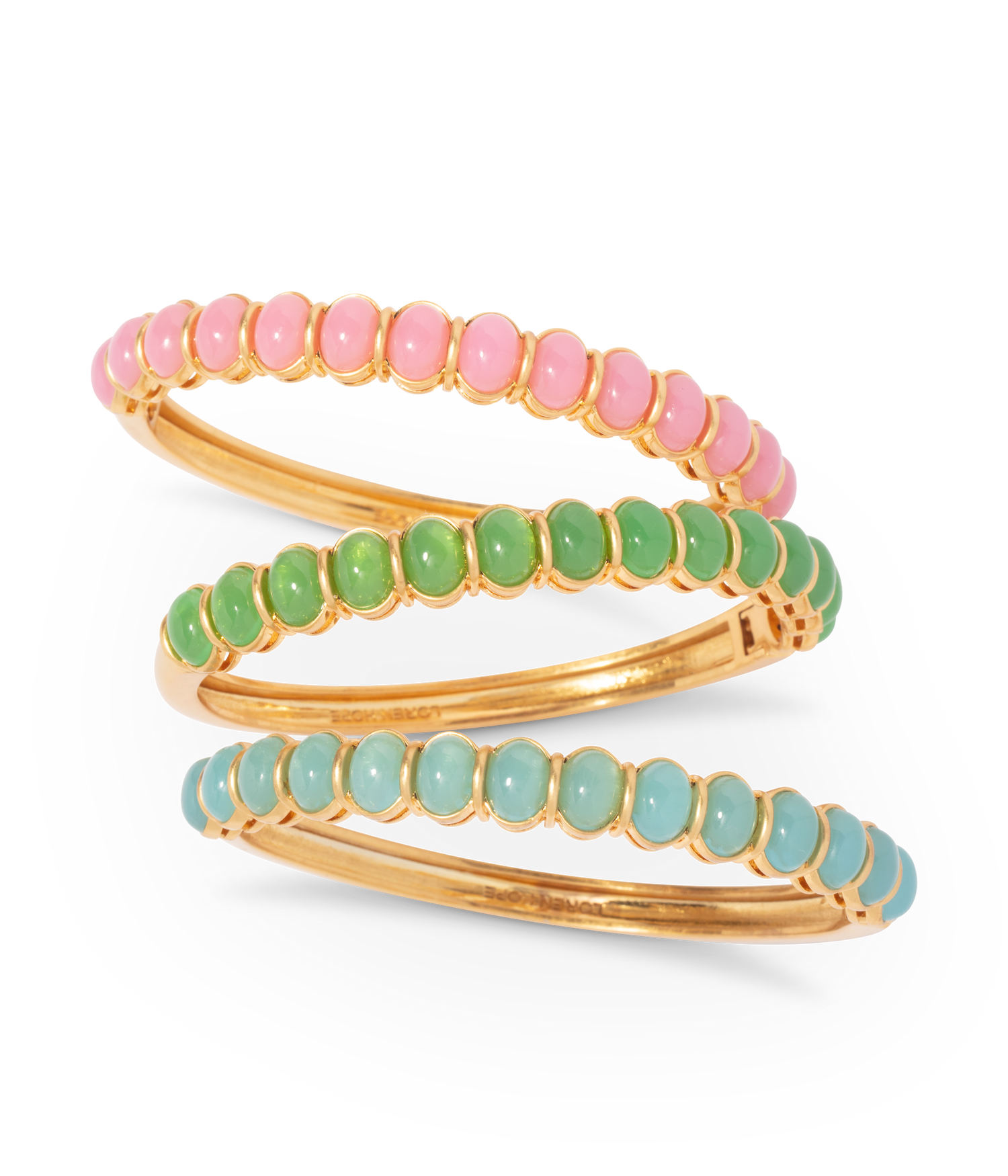 Handcrafted in brass with an 18K antiqued gold finish, featuring acrylic stones. Bangle measures 2.8" x 2.4" with a hinge closure for easy wear.