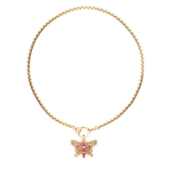 Logan Butterfly Pendant is crafted in brass with an 18K gold finish, featuring glass and acrylic stones. Pendant measures 1.18' x 1.08'. The Scottie Chain is handcrafted in brass, with a 16' length plus 2' extender.