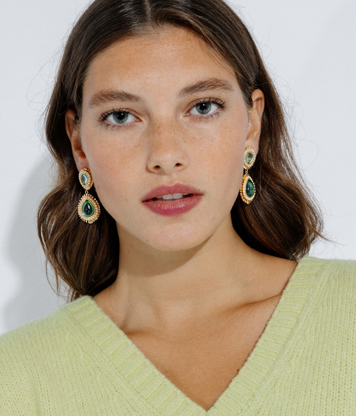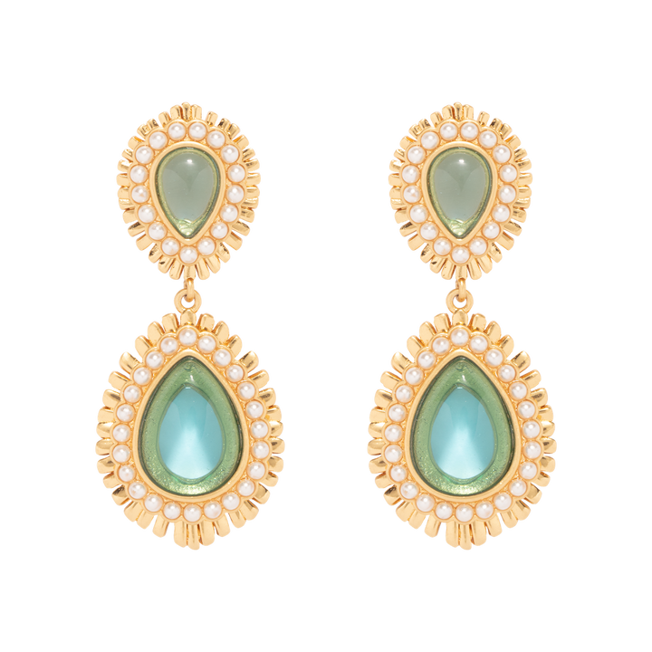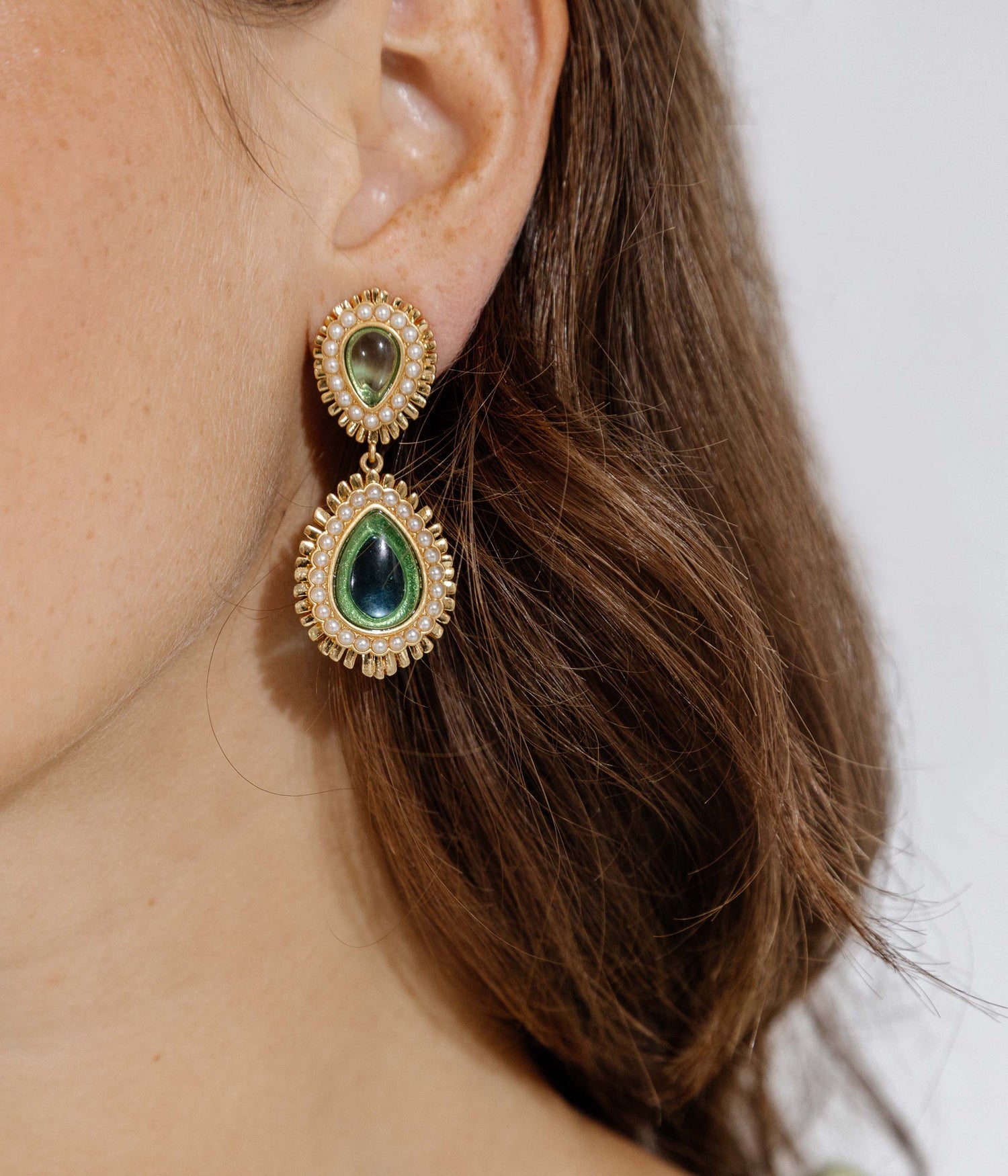 Handcrafted in brass with an 18K gold finish, featuring glass stones and surgical steel posts. Earrings measure 1.95' drop x 0.83'.