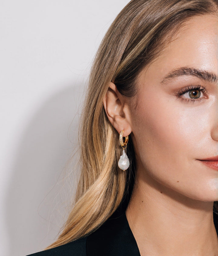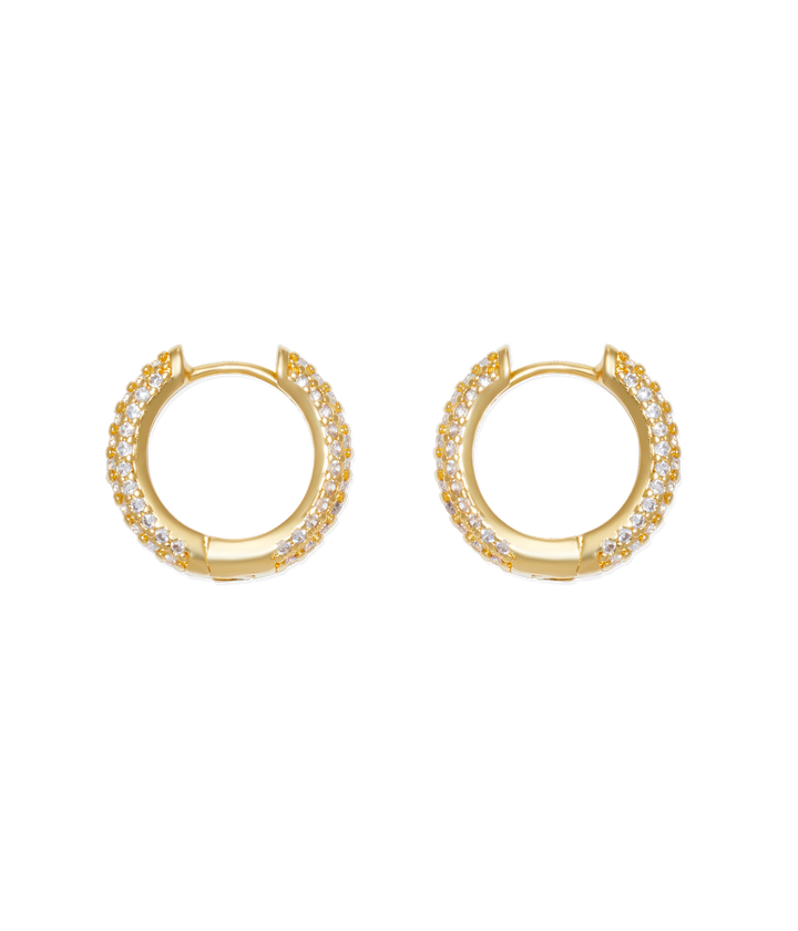 Handcrafted in brass with a gold finish, featuring pavé stones. Hoops measure 0.5' in diameter.