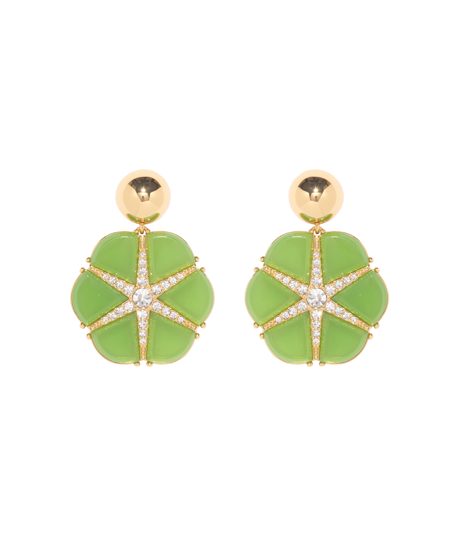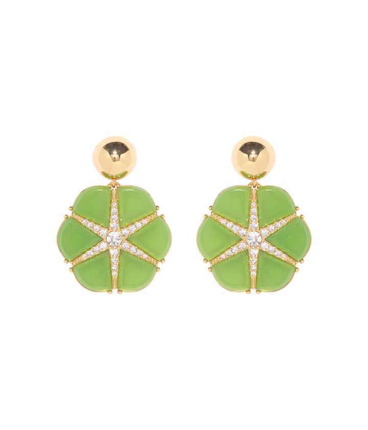 These Rosemary Statement Earrings in Green by Loren Hope — Embrace retro glamour with these stunning earrings inspired by the 1960s. Featuring button stud details and celestial crystal accents, they radiate main character energy. Available in vibrant green or pink, these statement drops are perfect for adding a bold touch to any outfit. Arrives in Loren Hope's signature dust bag.