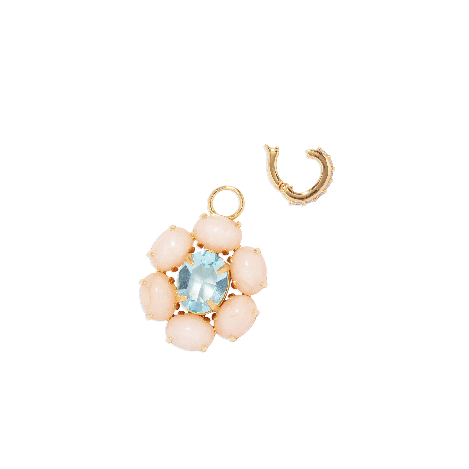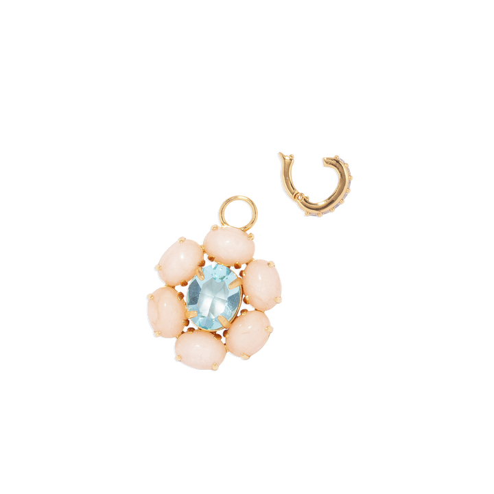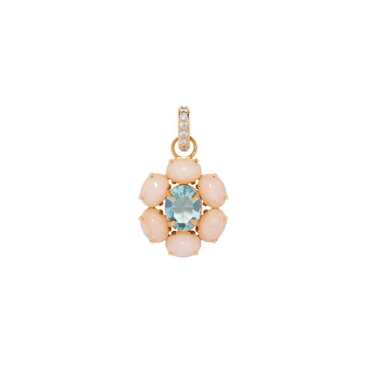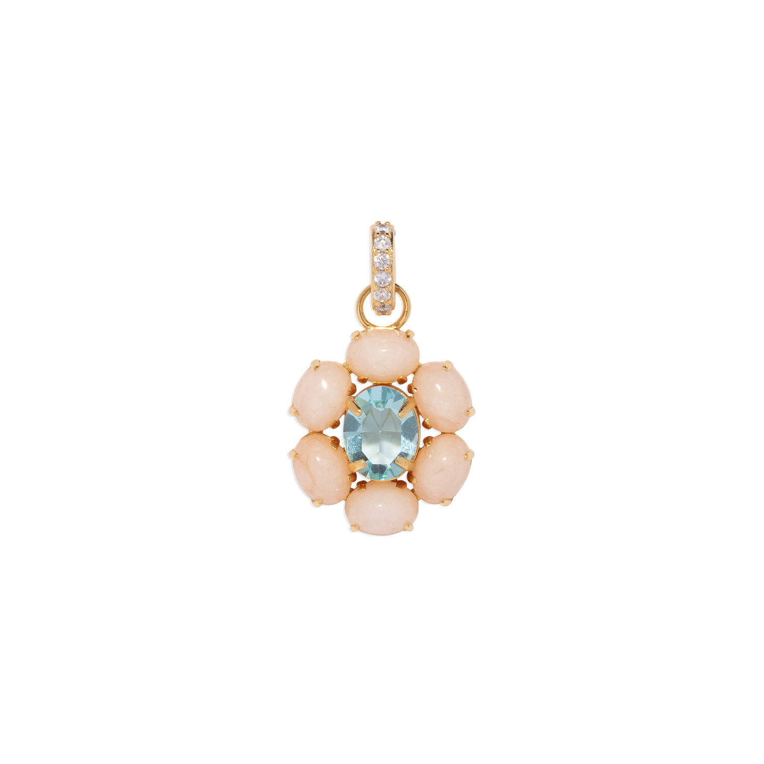Handcrafted with semi-precious jade cabochons, aqua glass stones, and an 18K gold finish over brass. Pendant measures 1.0" drop x 0.75".